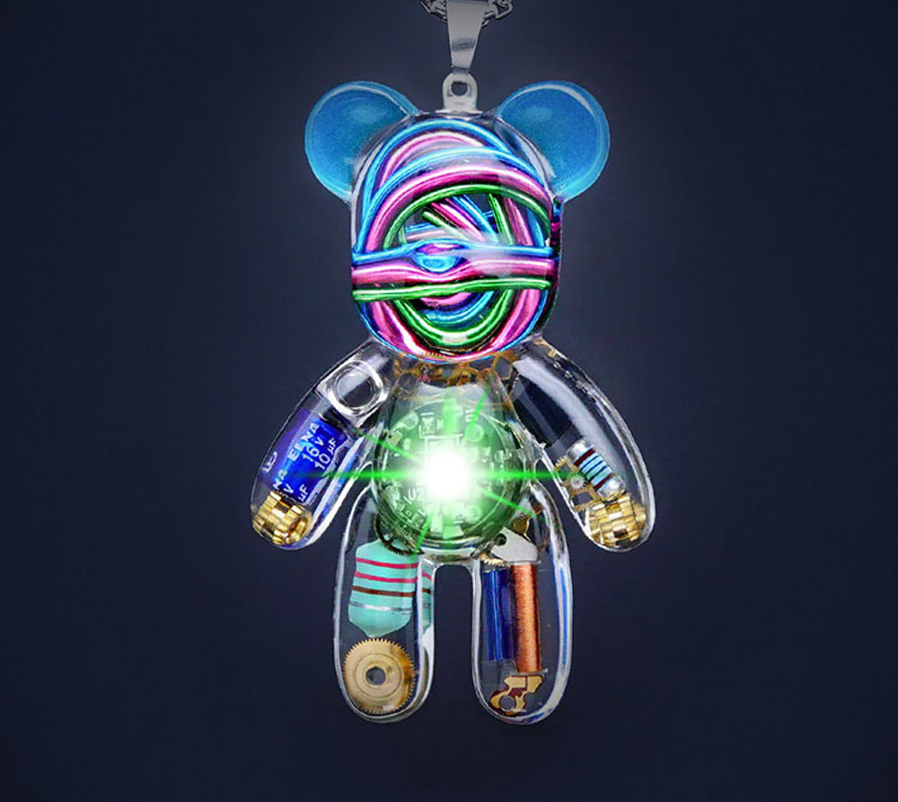 Luminous Necklace inspired by the classic Bearbrick toy. Handcrafted one by one, each necklace has a built-in luminous effect that will last up to 32 hours of continuous use.