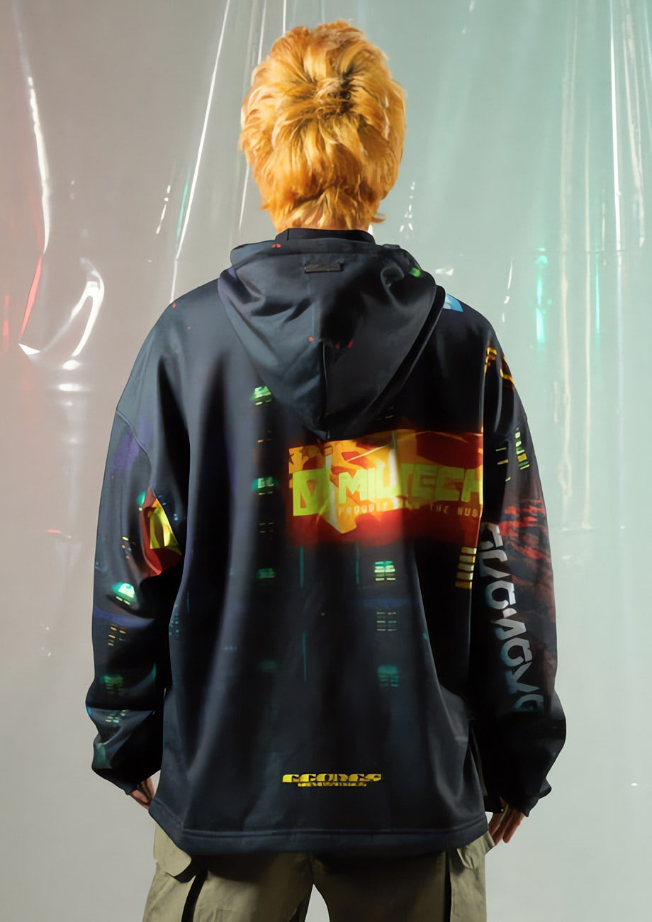 This unique hoodie features a beautiful illustration of a futuristic cityscape resembling the scenes in the classic Cyberpunk 2077 Edgerunners series.