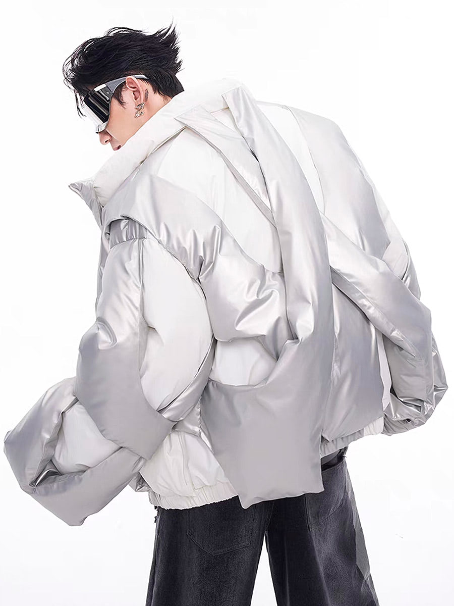 Long-Sleeve Winter Jacket in futuristic aesthetics inspired by the fashion of sci-fi films.