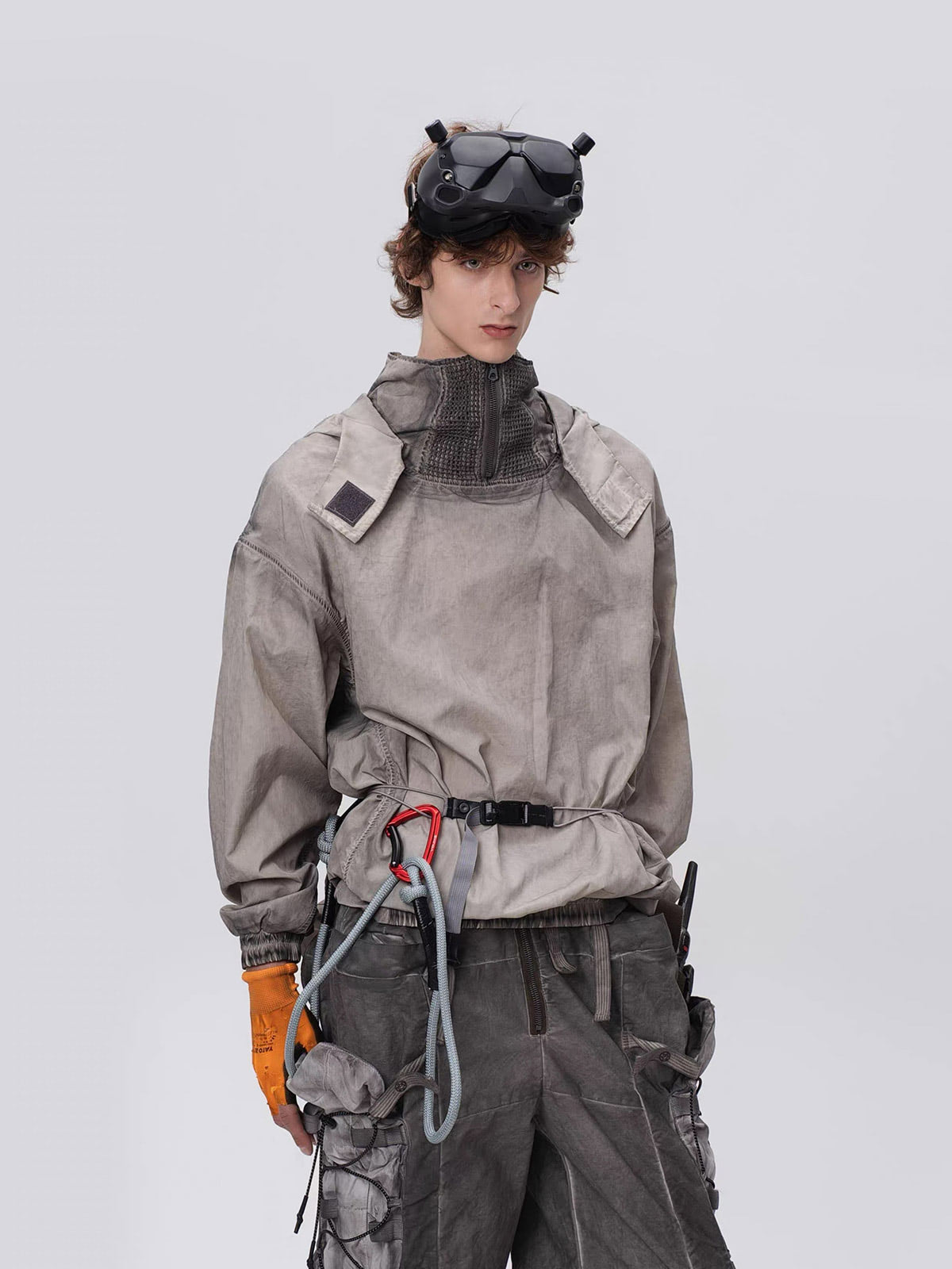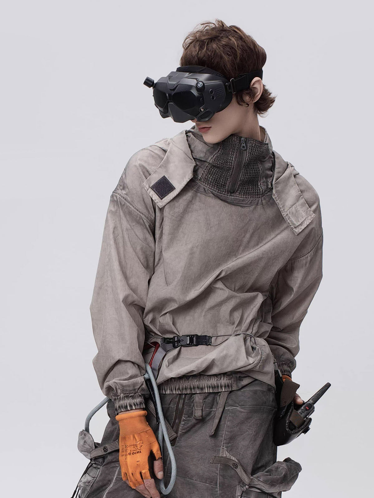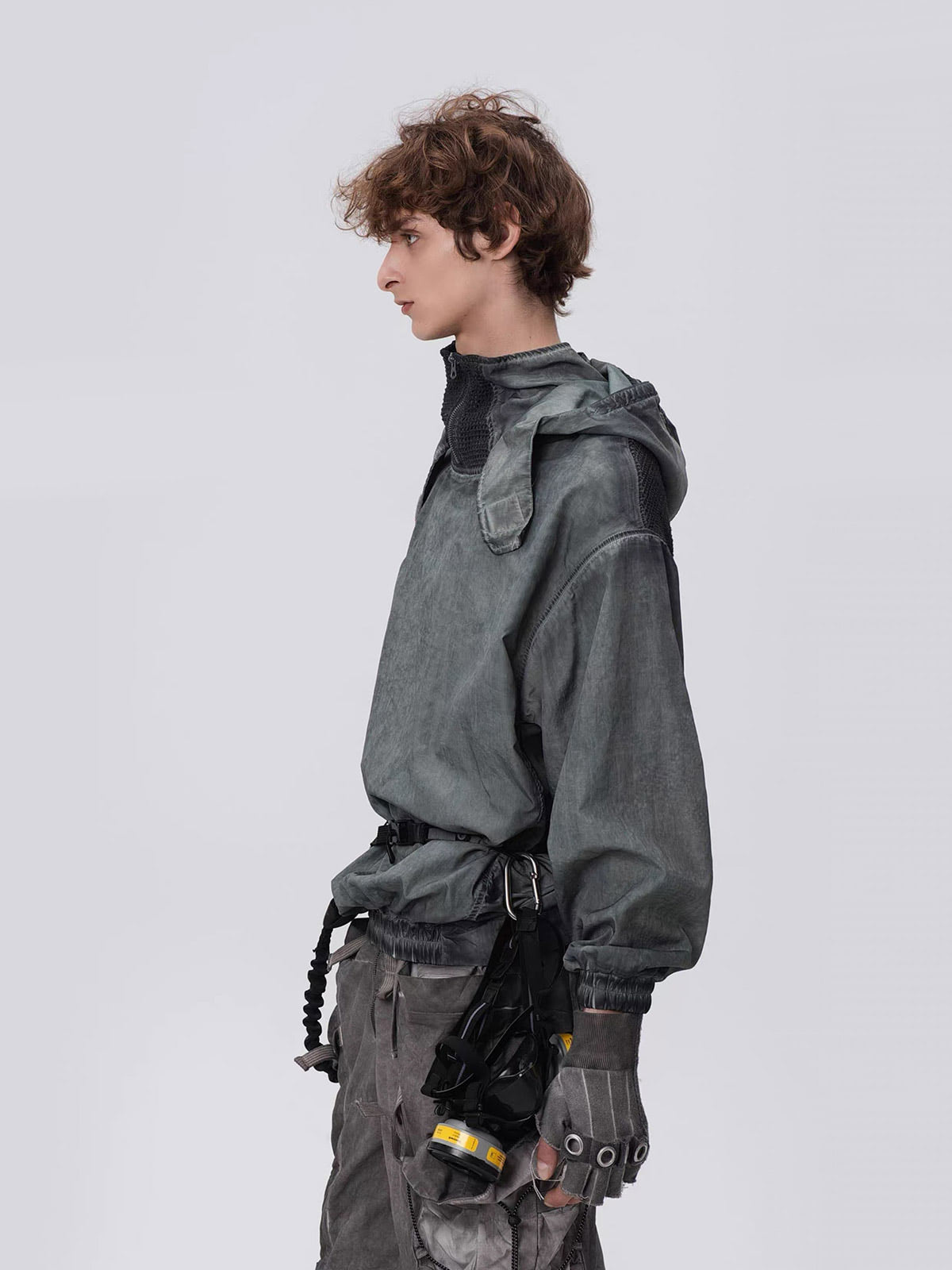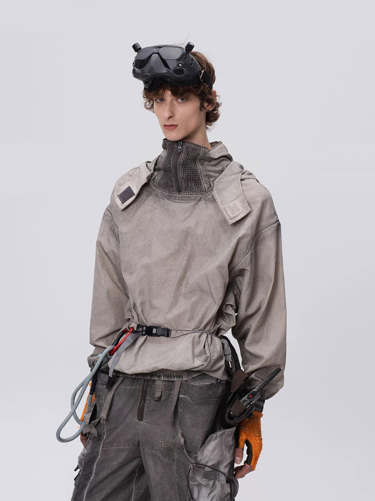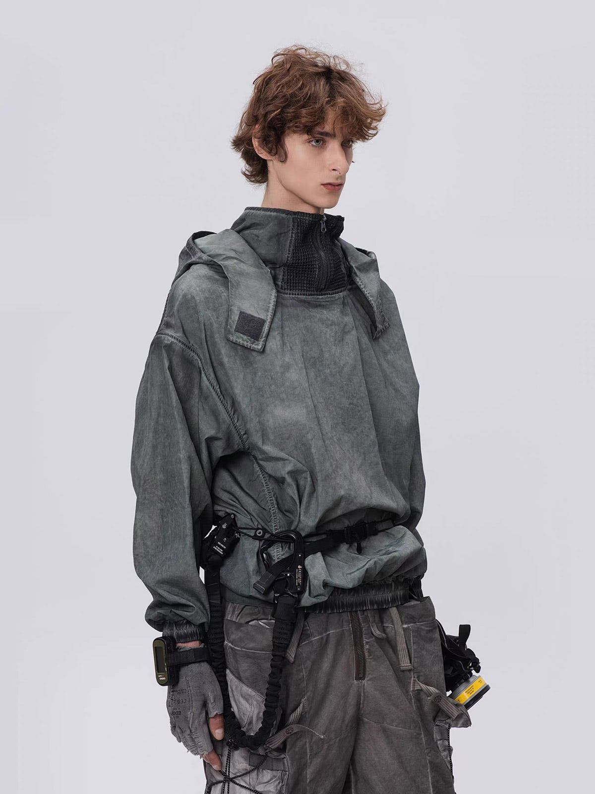 Featuring a dirty-dyed fabric treatment, this futuristic top fuses unique tailoring and practicality.