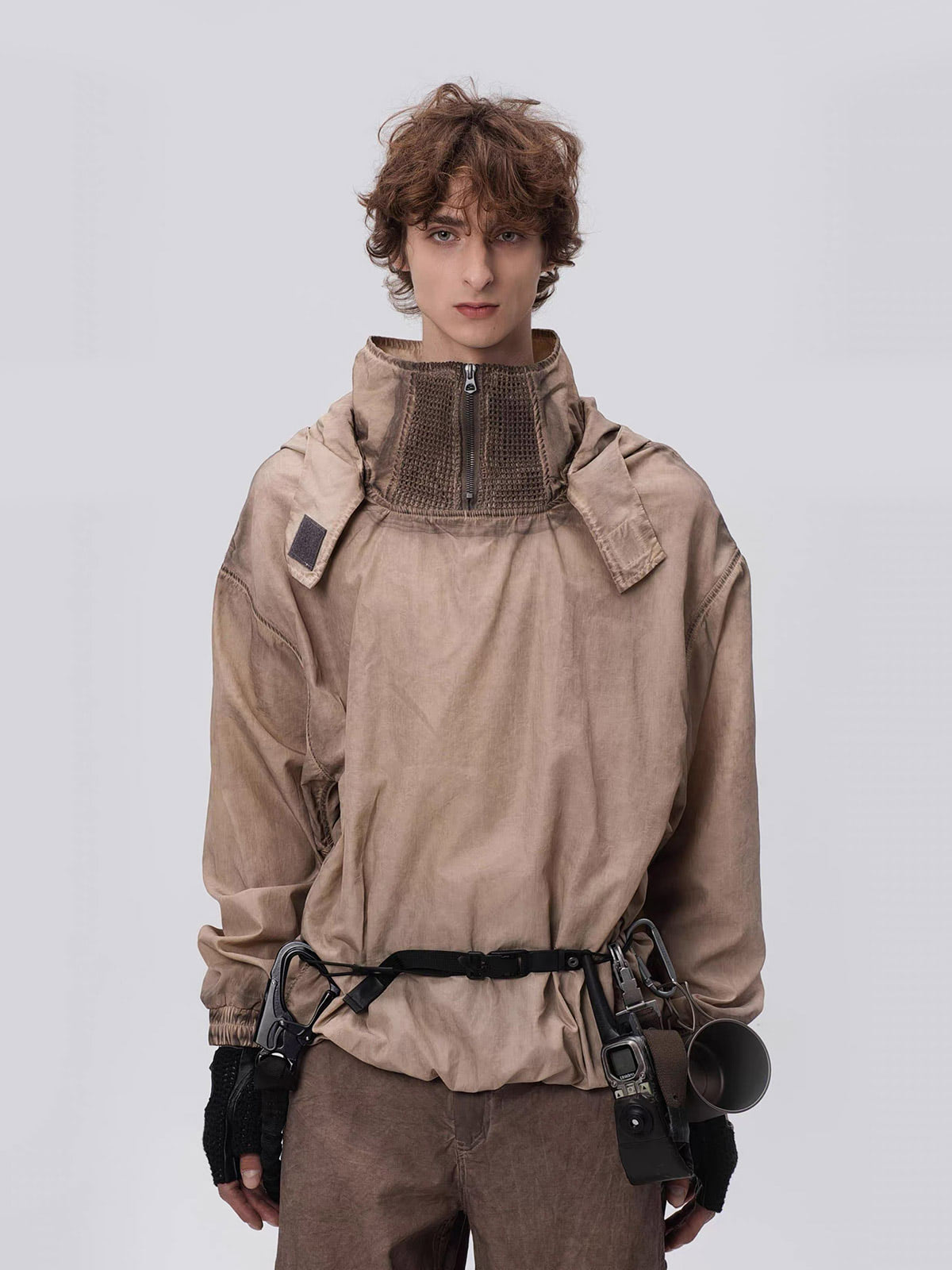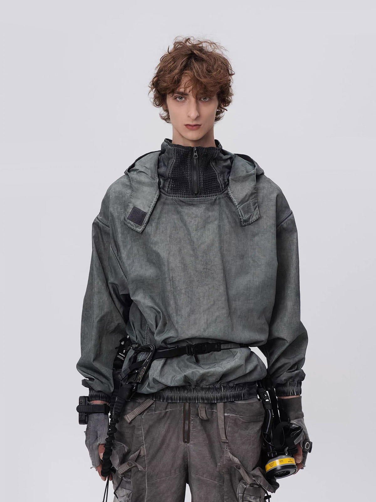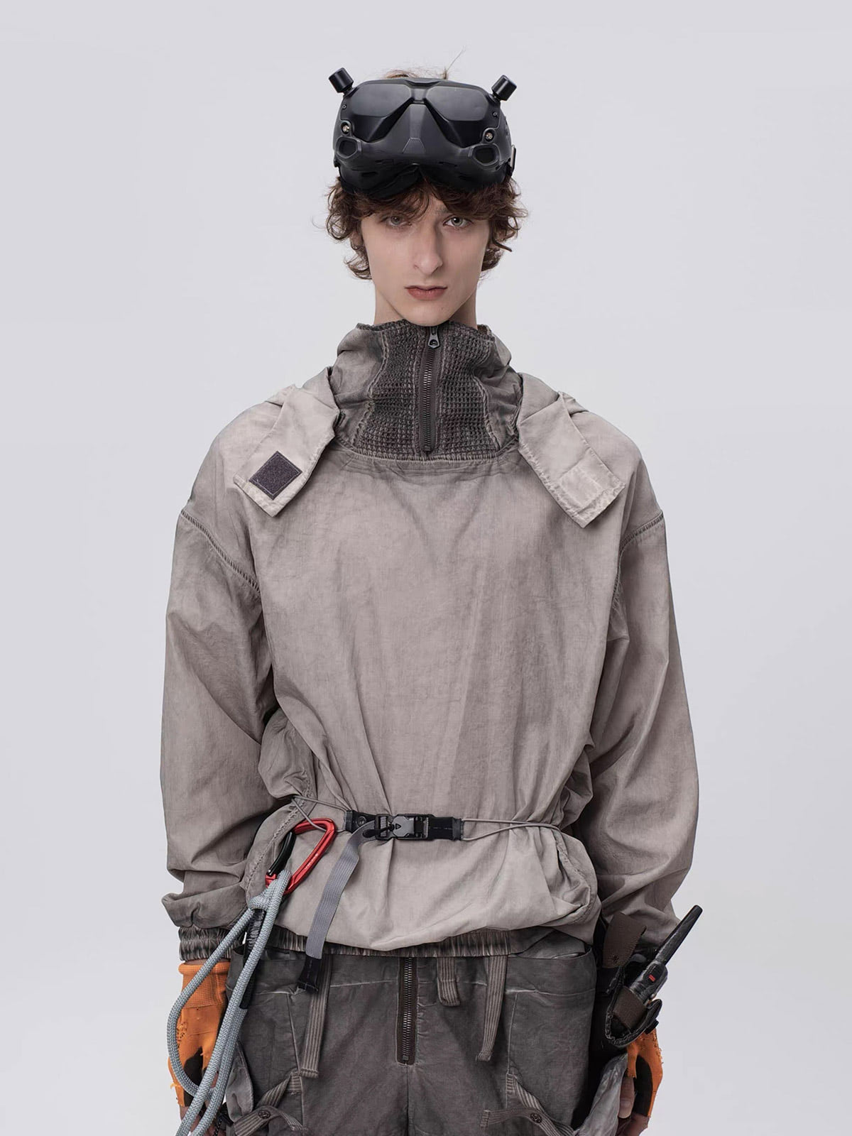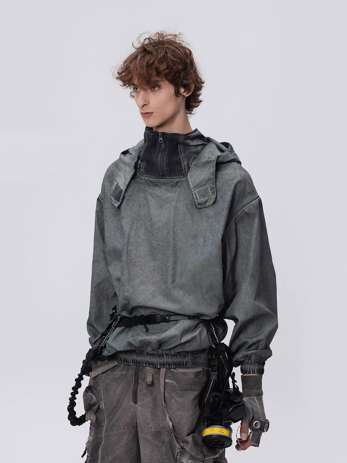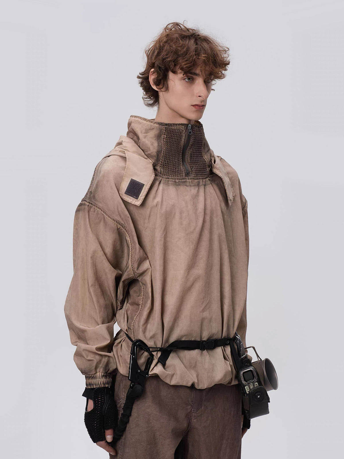 Featuring a dirty-dyed fabric treatment, this futuristic top fuses unique tailoring and practicality.