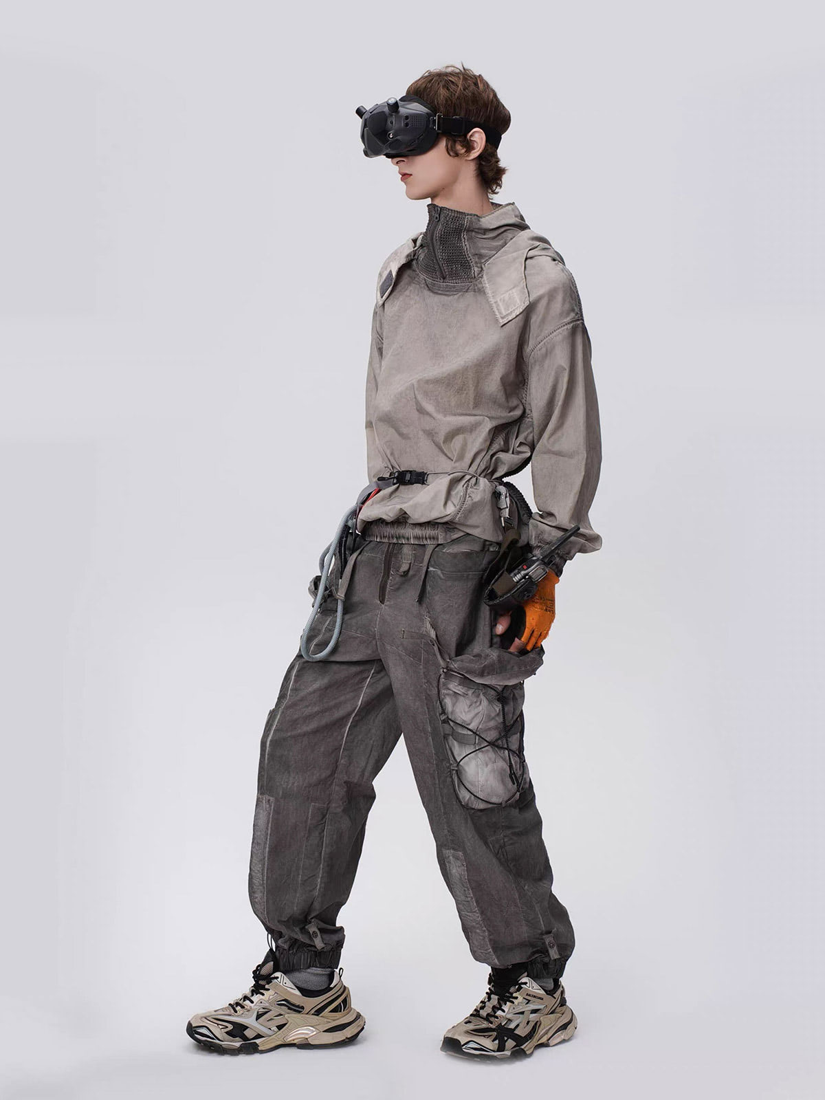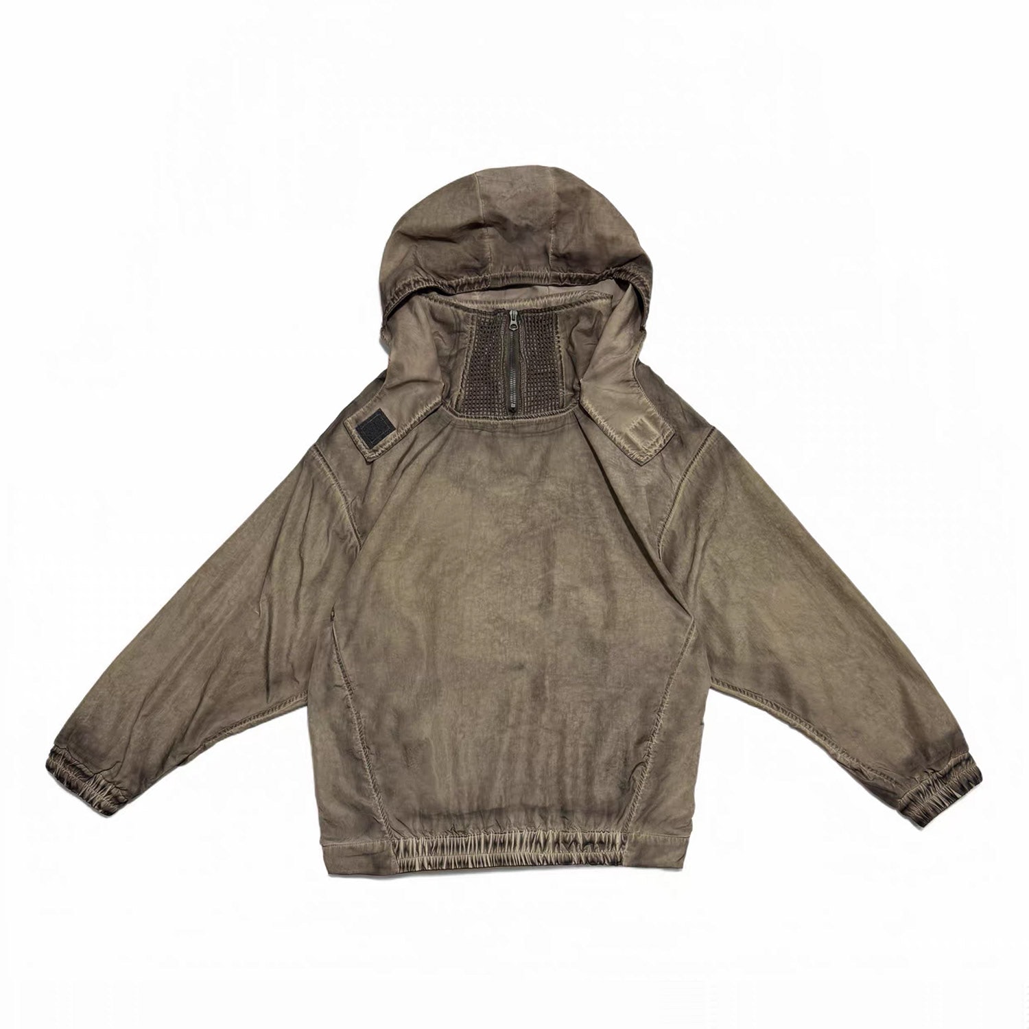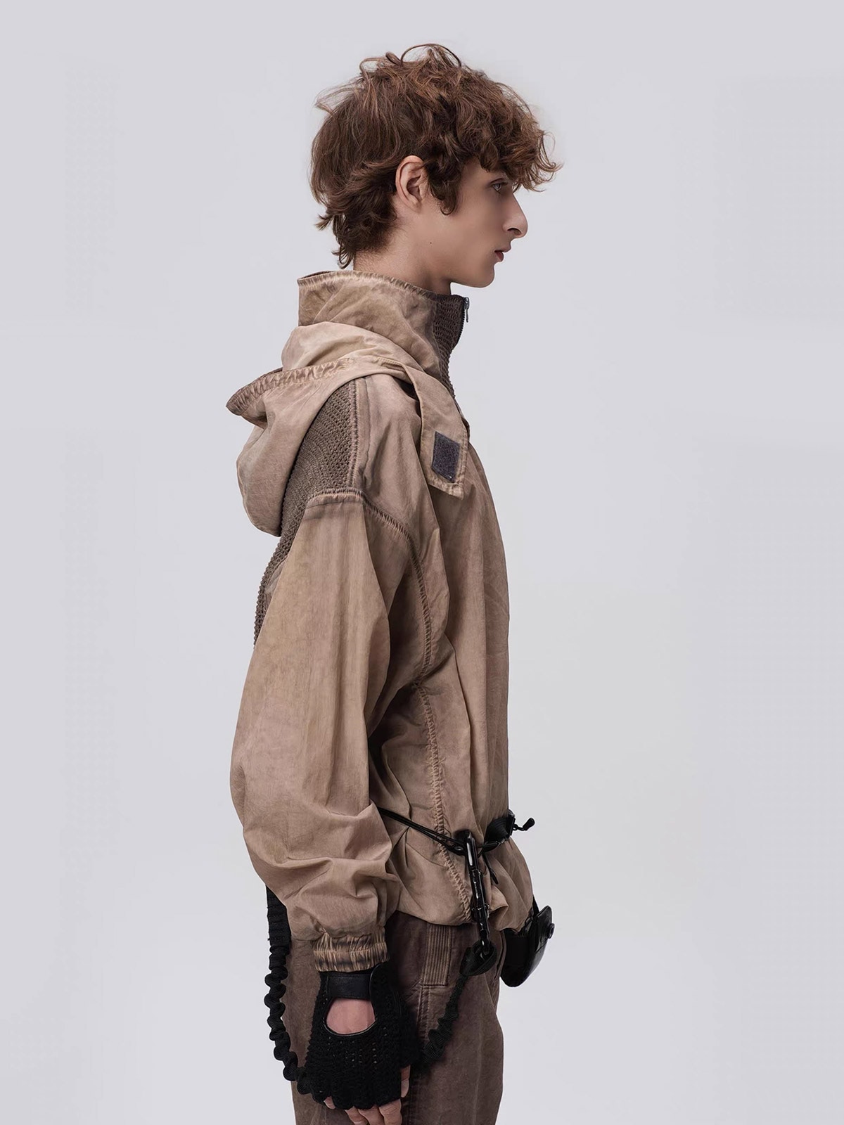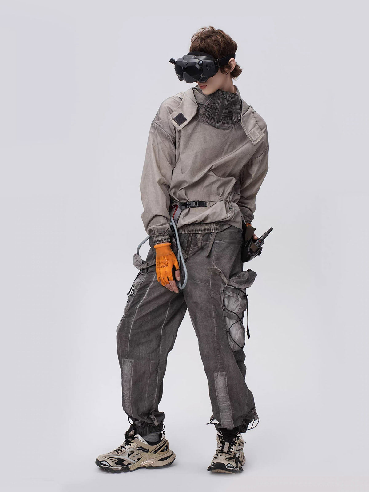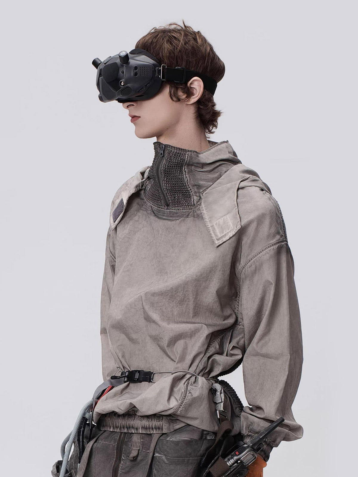Featuring a dirty-dyed fabric treatment, this futuristic top fuses unique tailoring and practicality.
