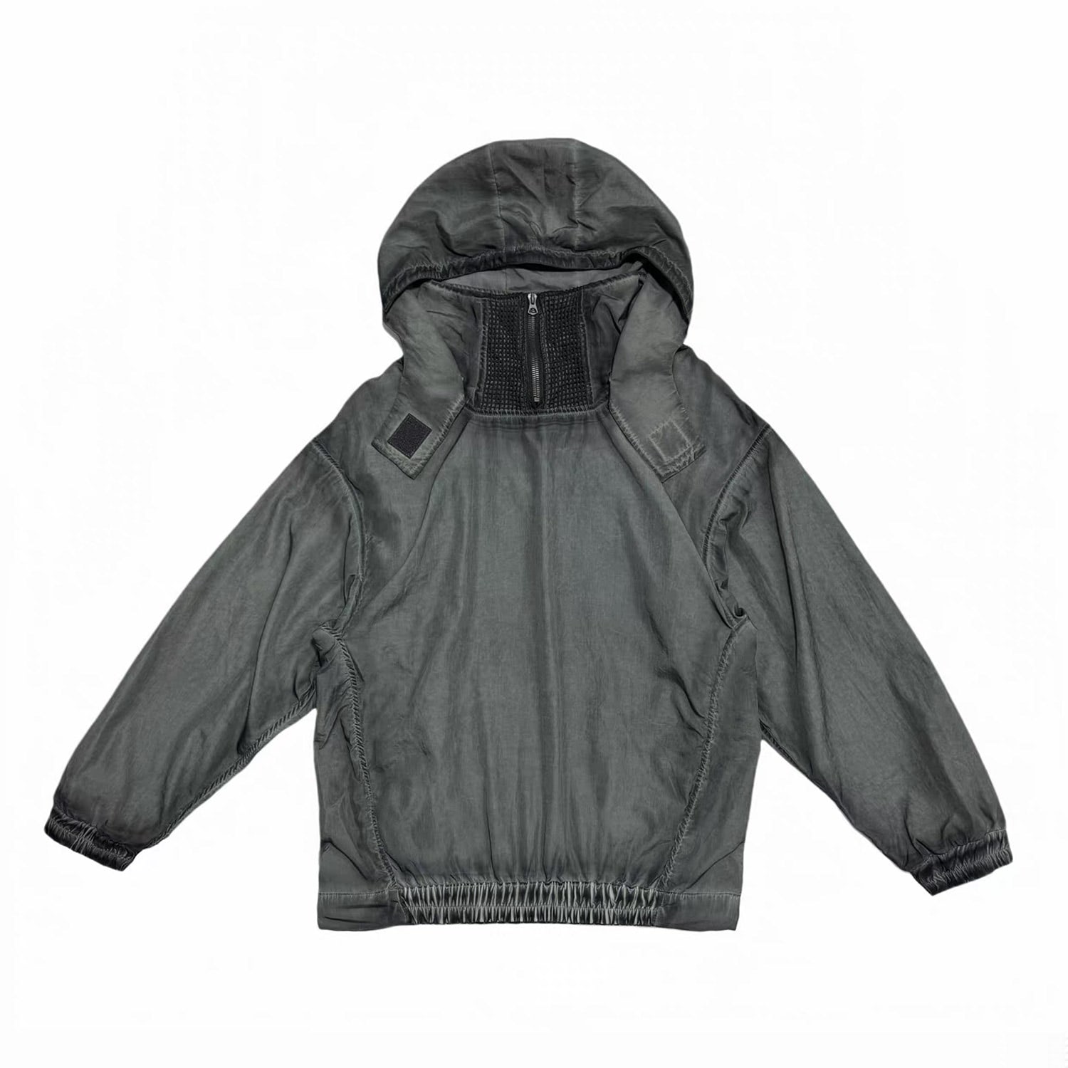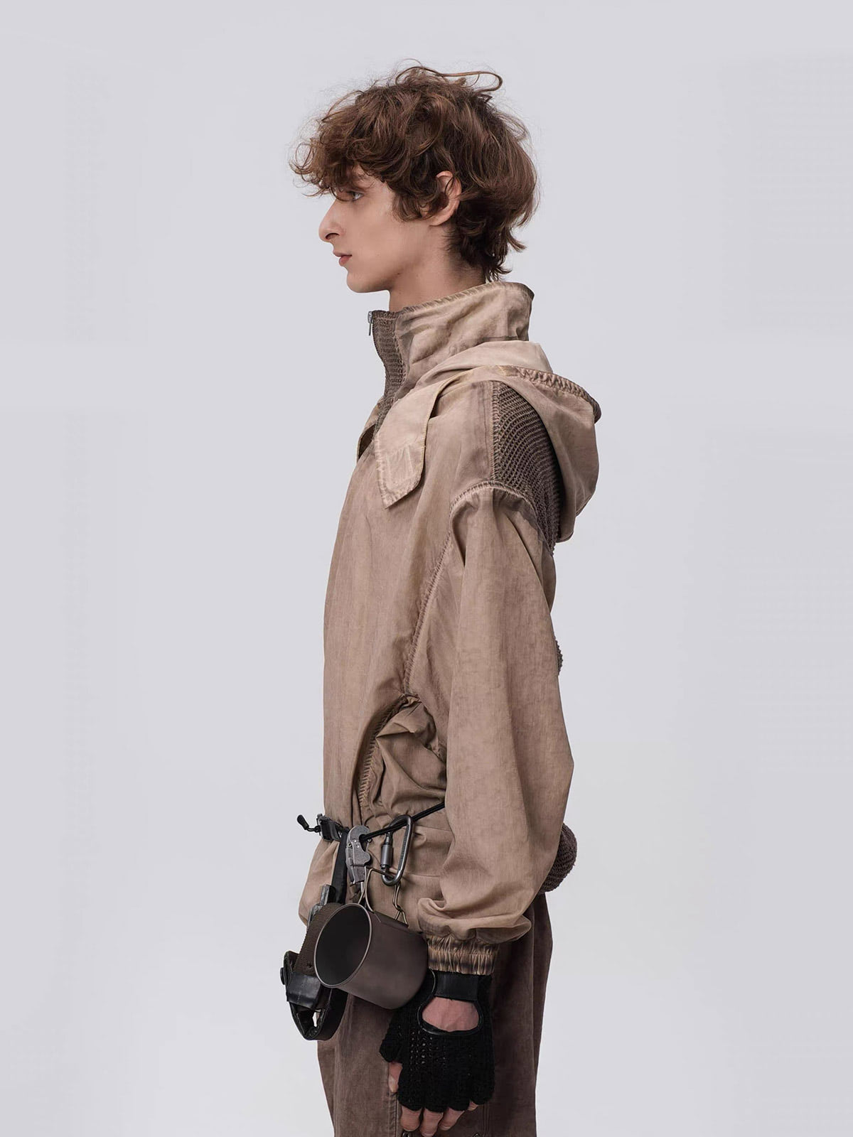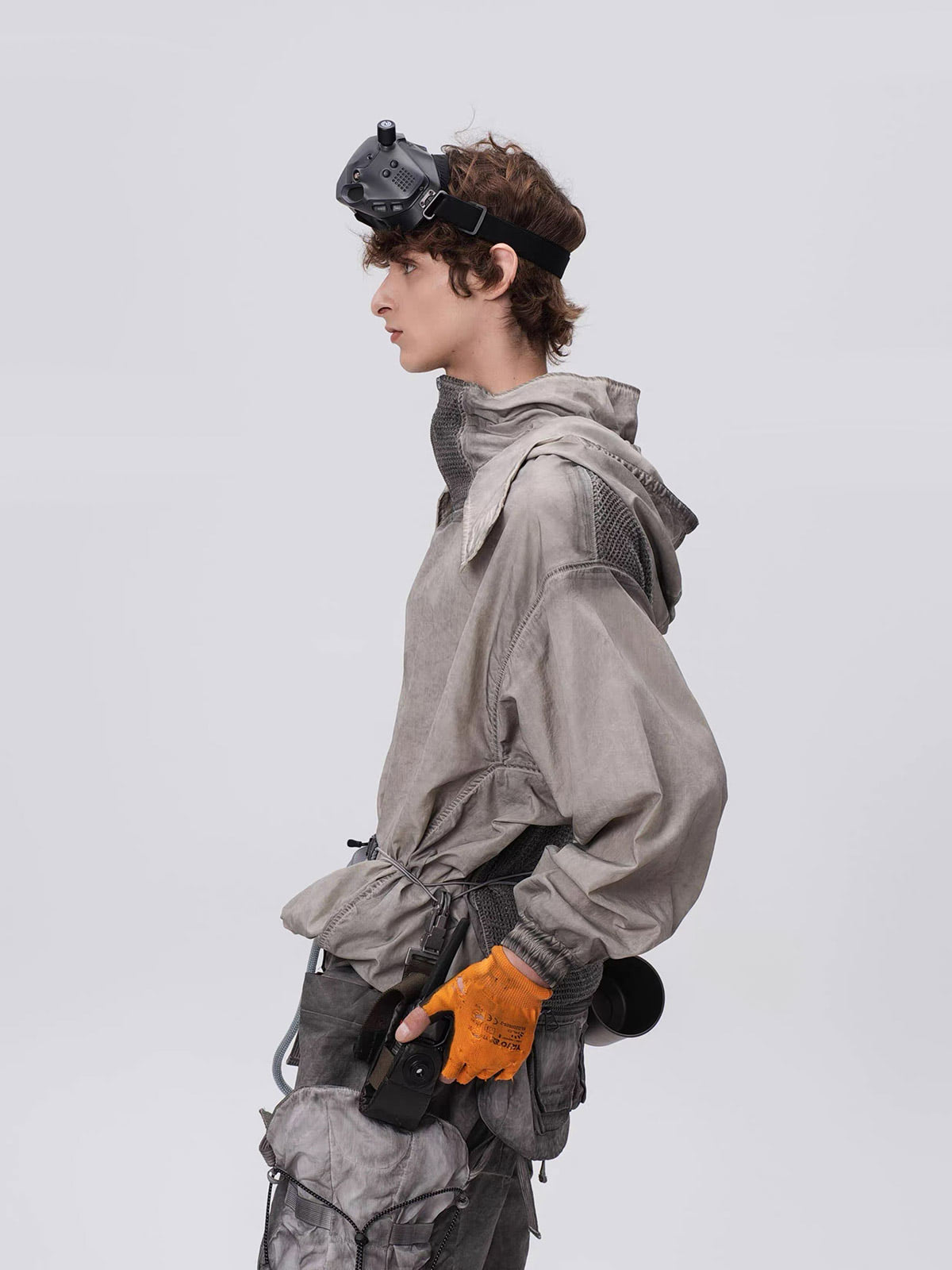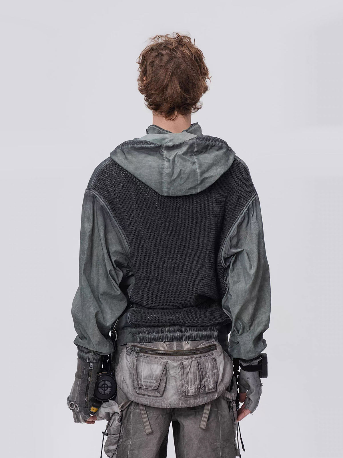 Featuring a dirty-dyed fabric treatment, this futuristic top fuses unique tailoring and practicality.