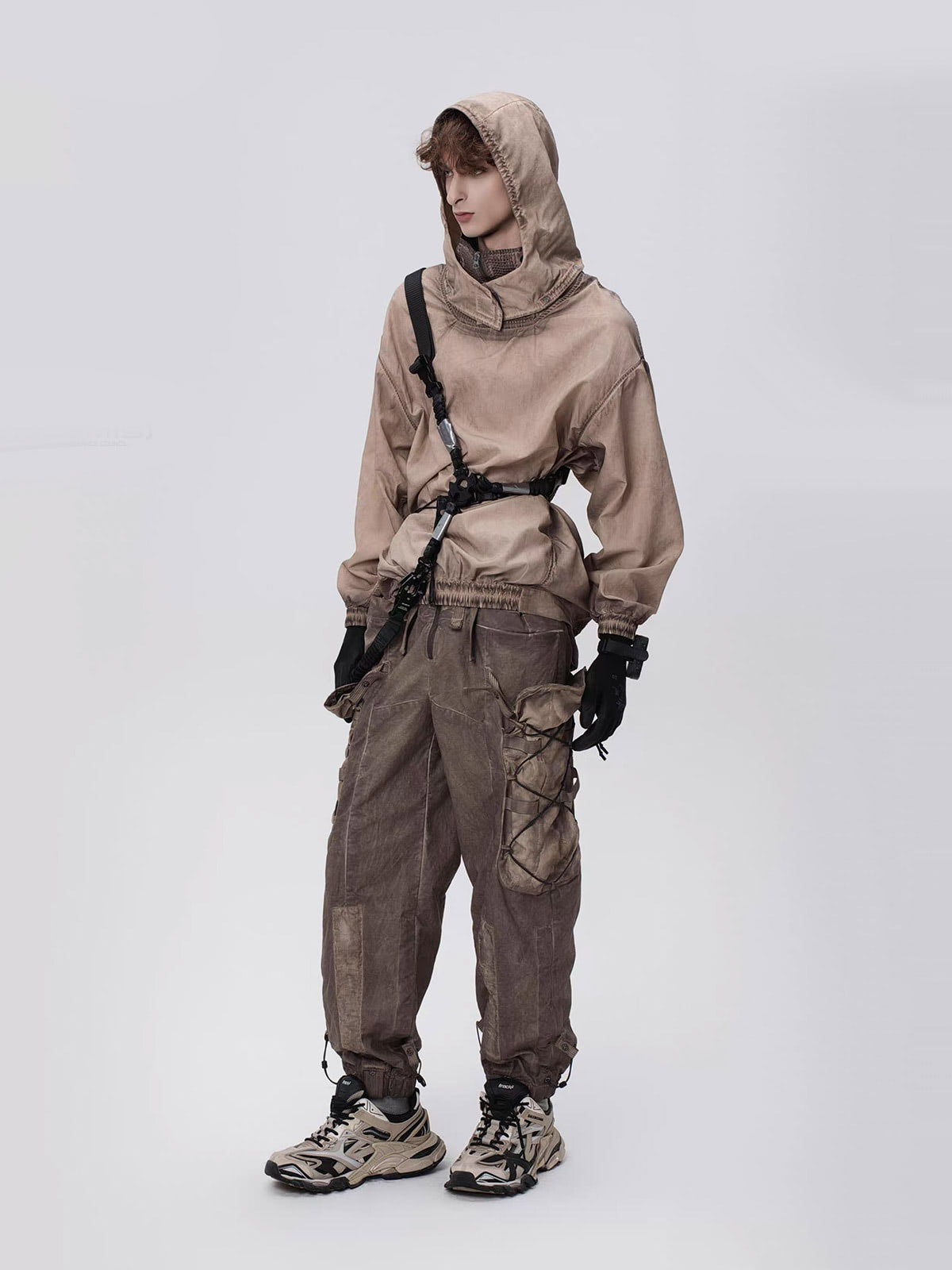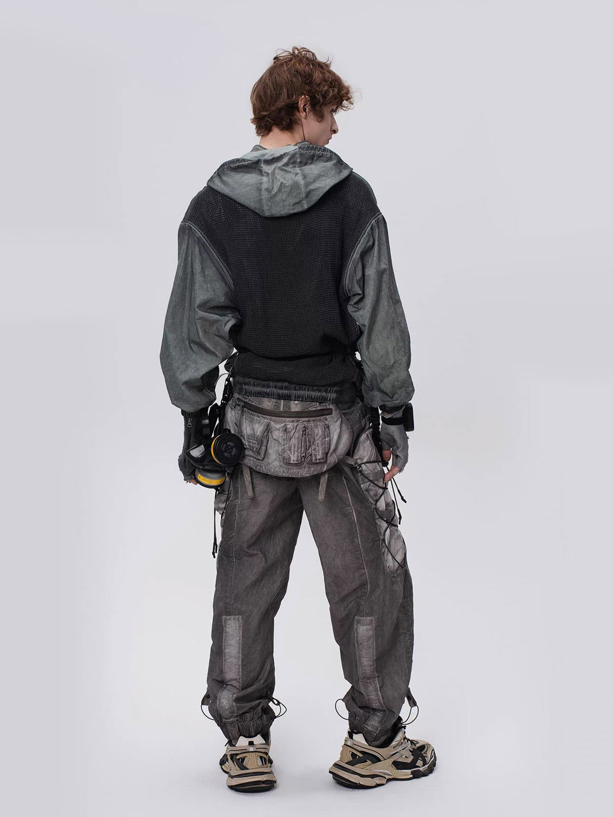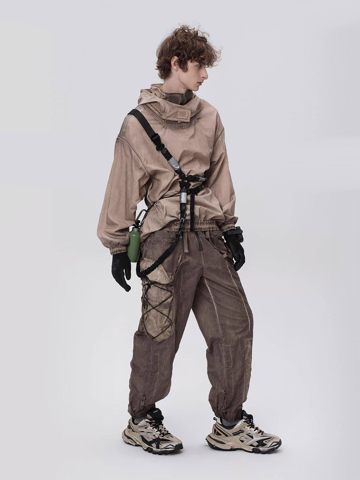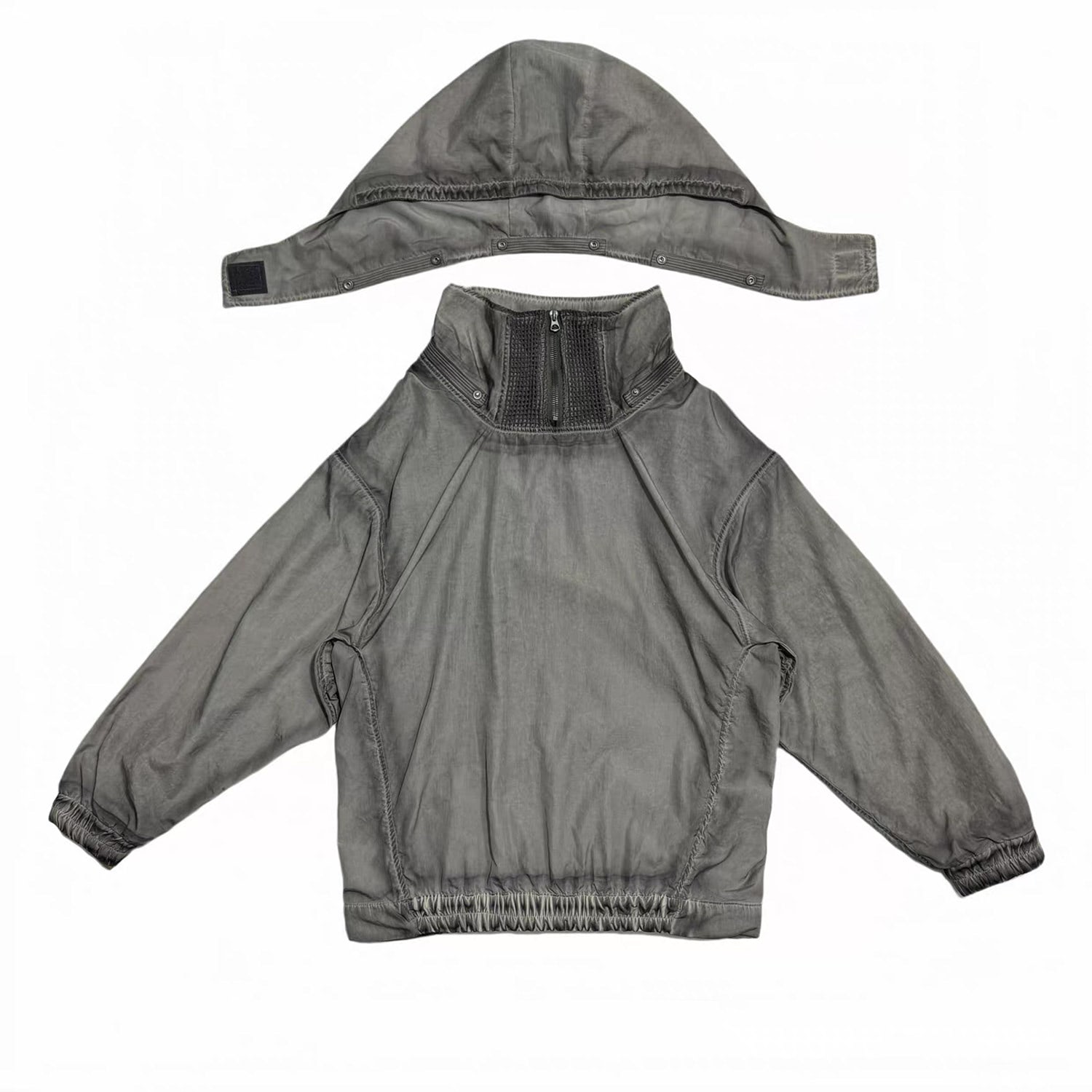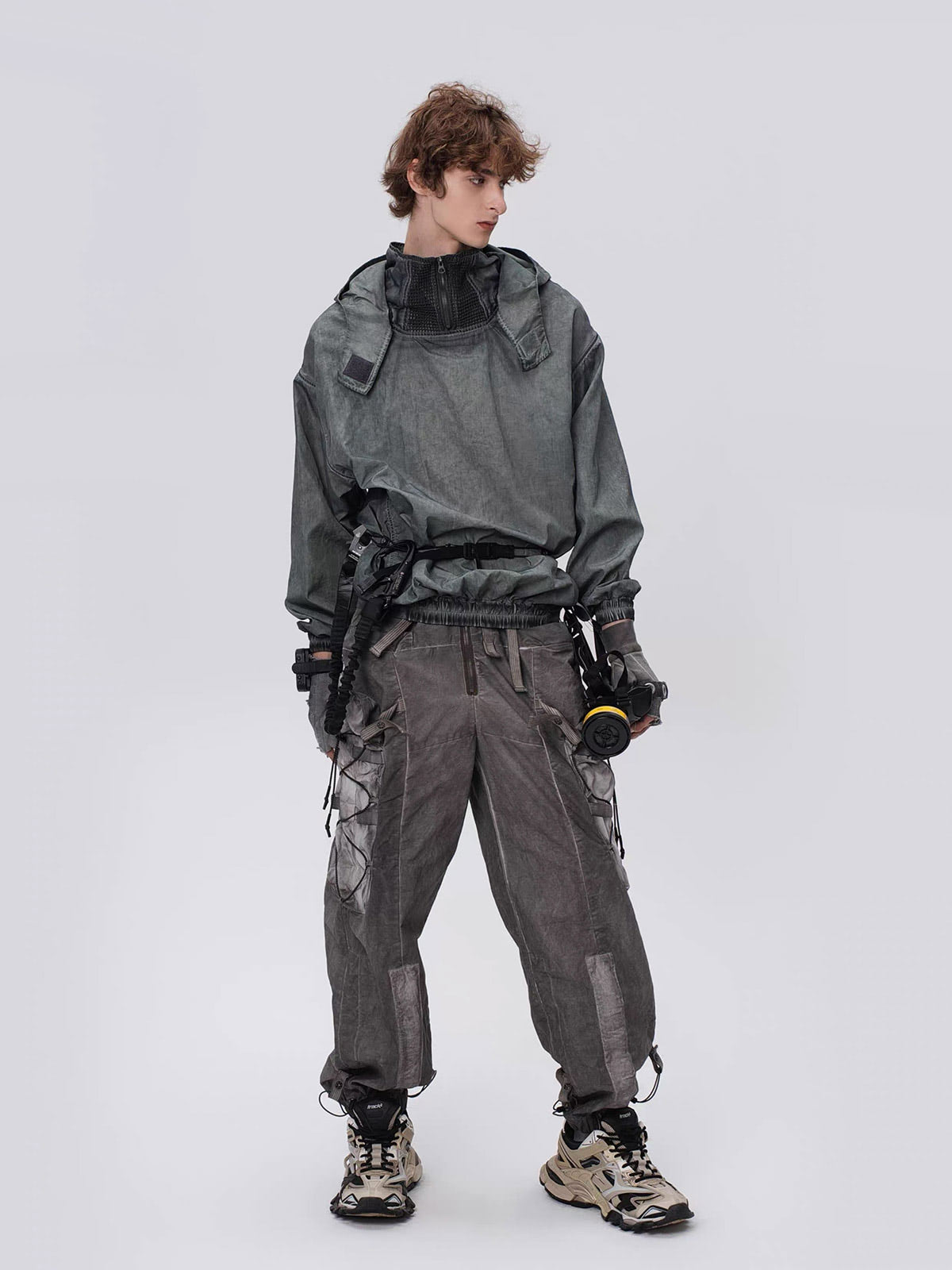 Featuring a dirty-dyed fabric treatment, this futuristic top fuses unique tailoring and practicality.