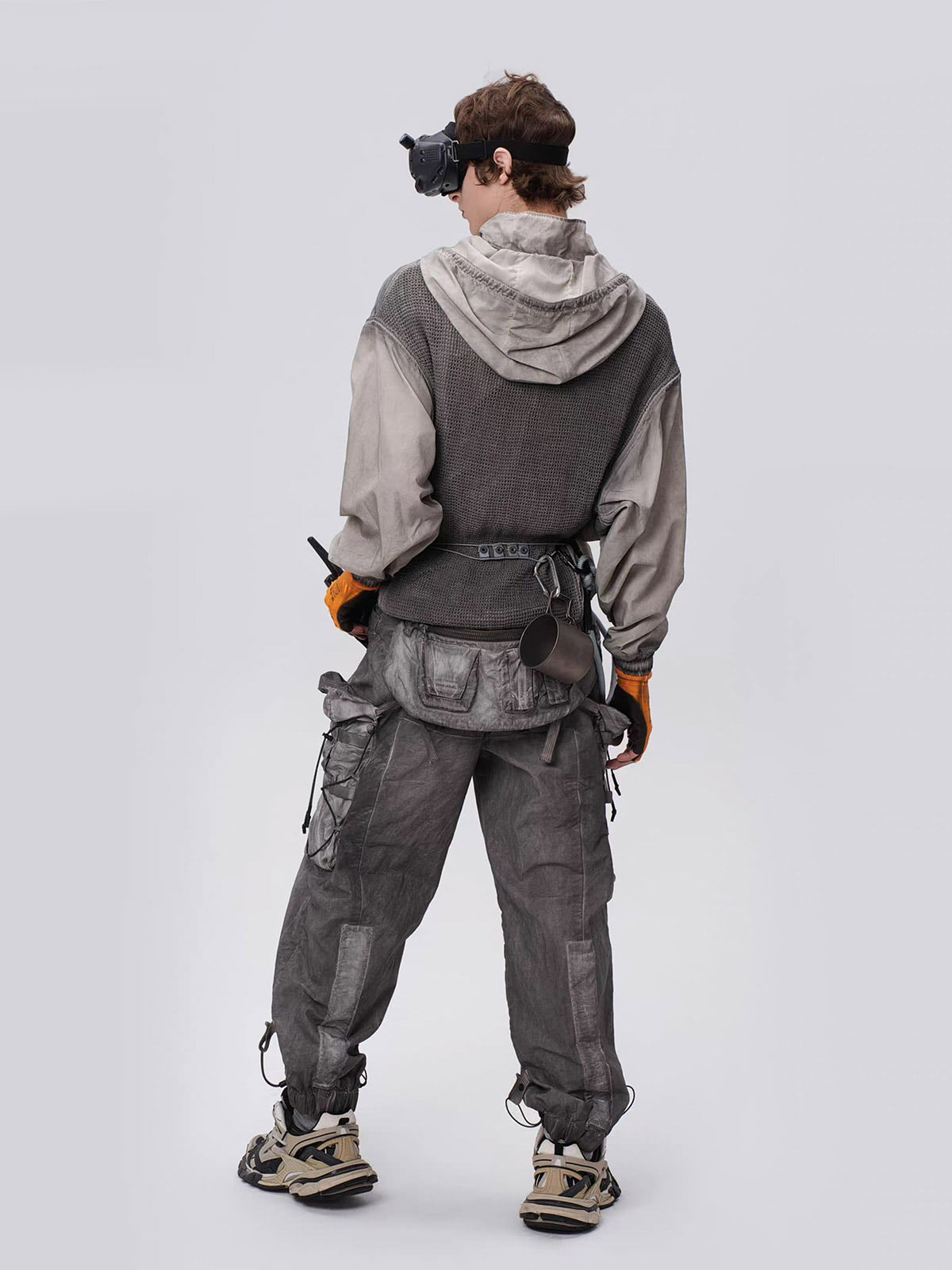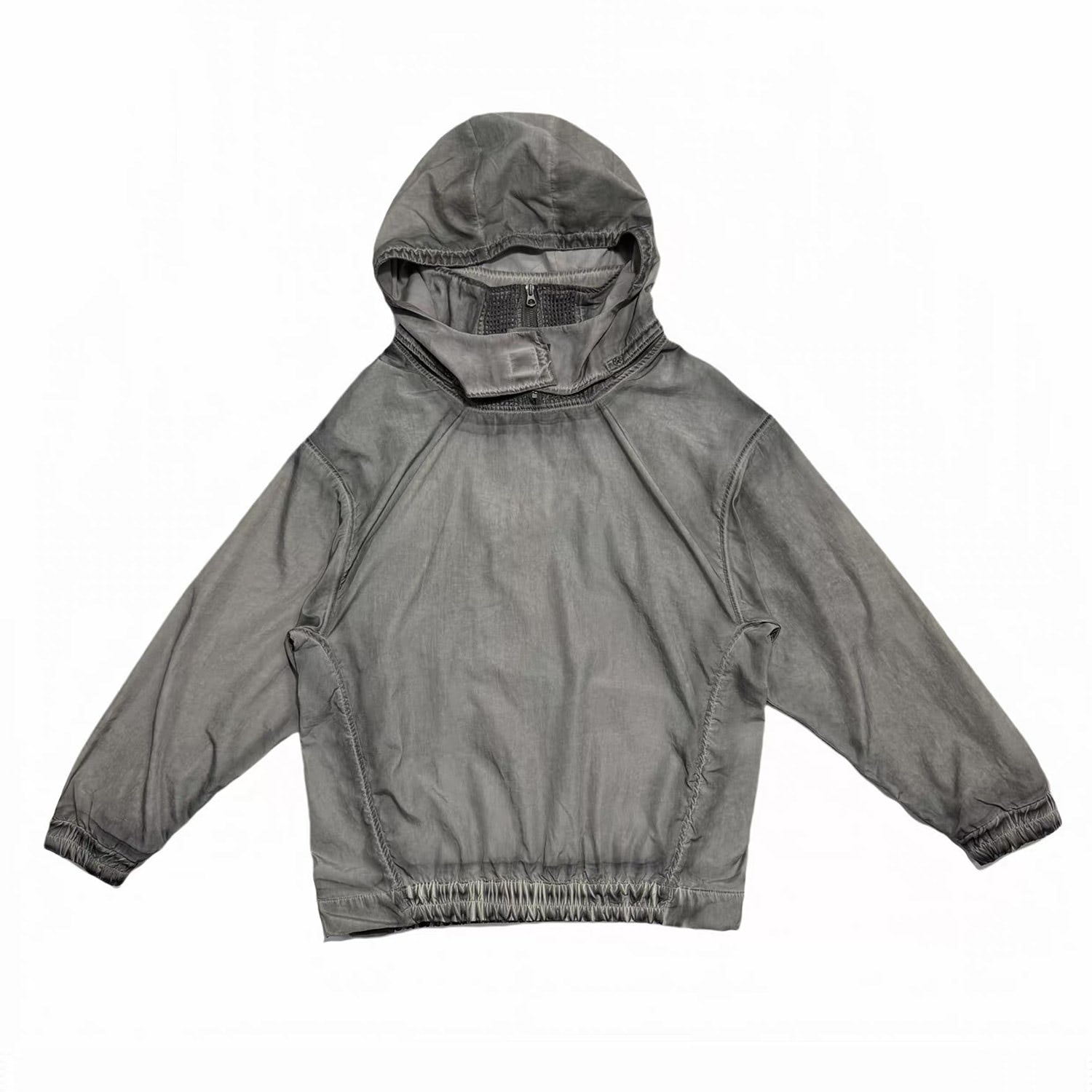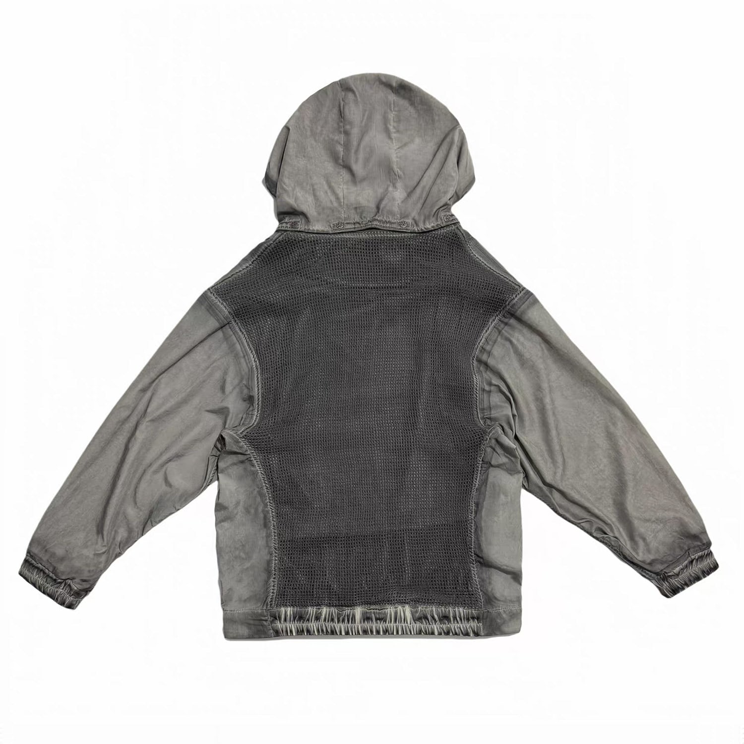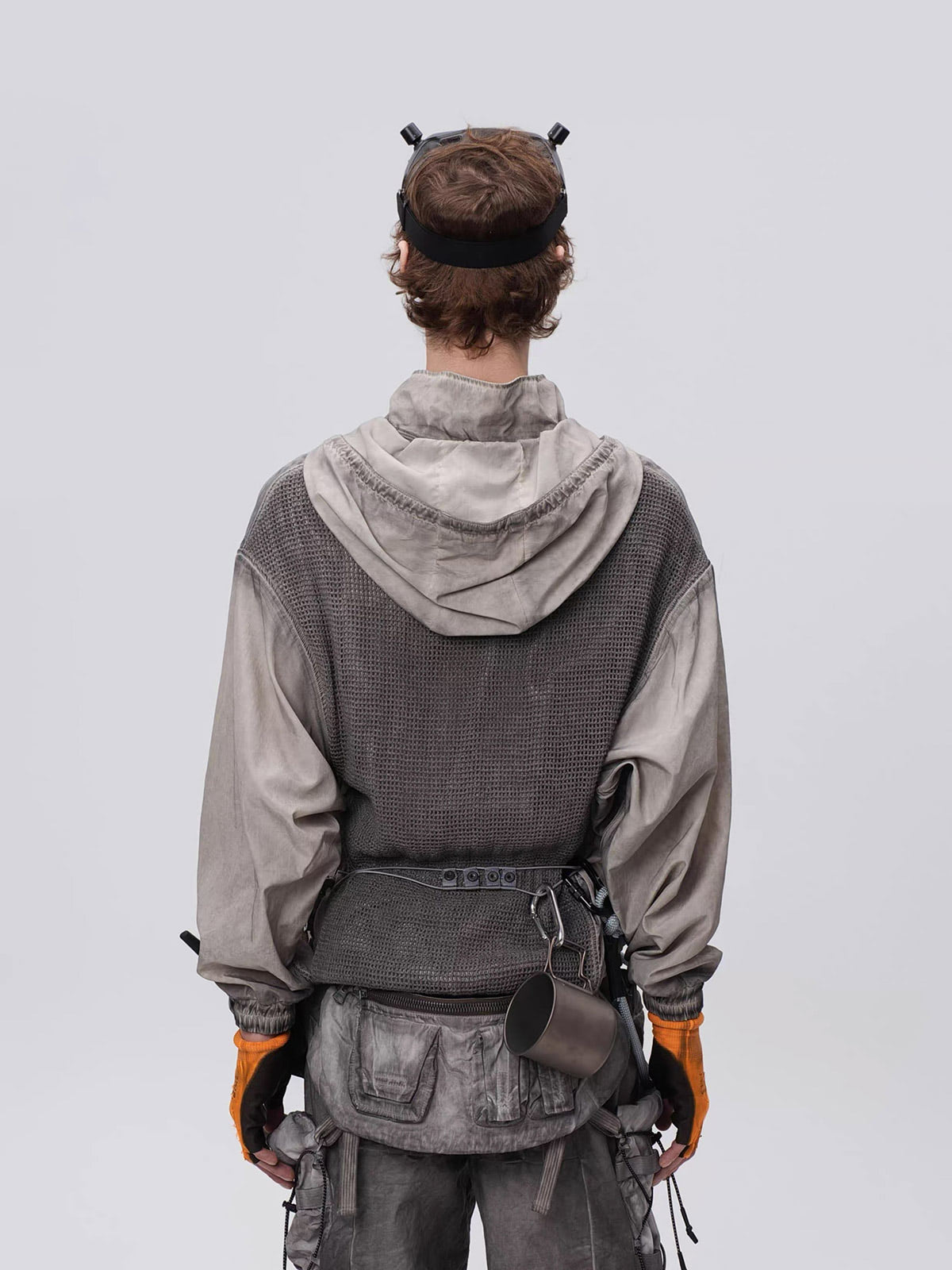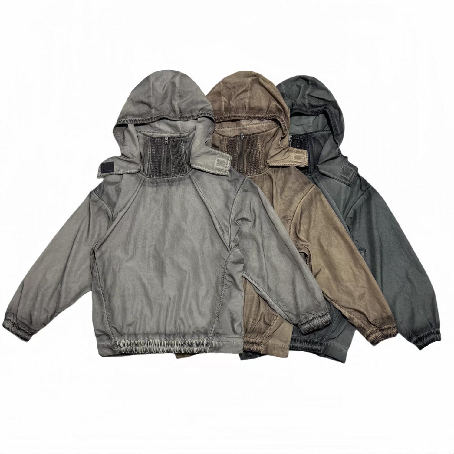 Featuring a dirty-dyed fabric treatment, this futuristic top fuses unique tailoring and practicality.