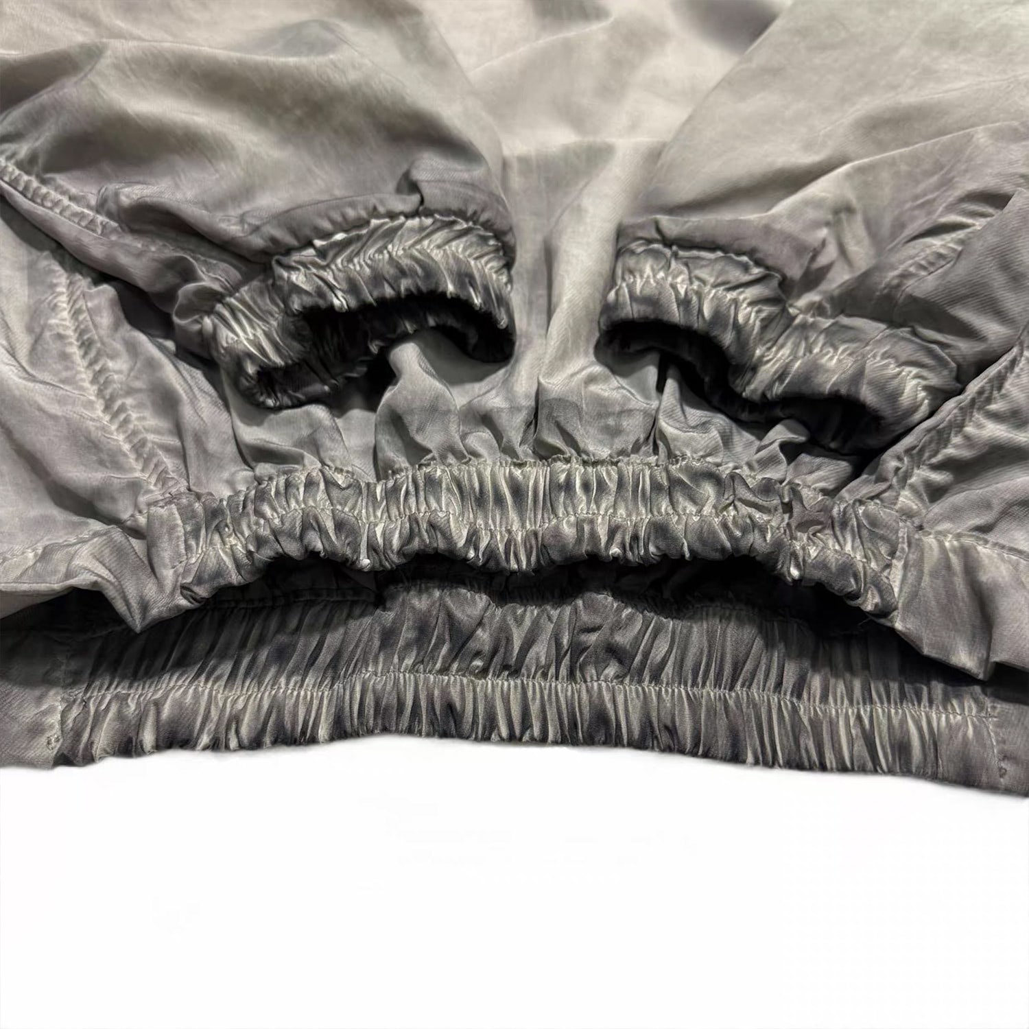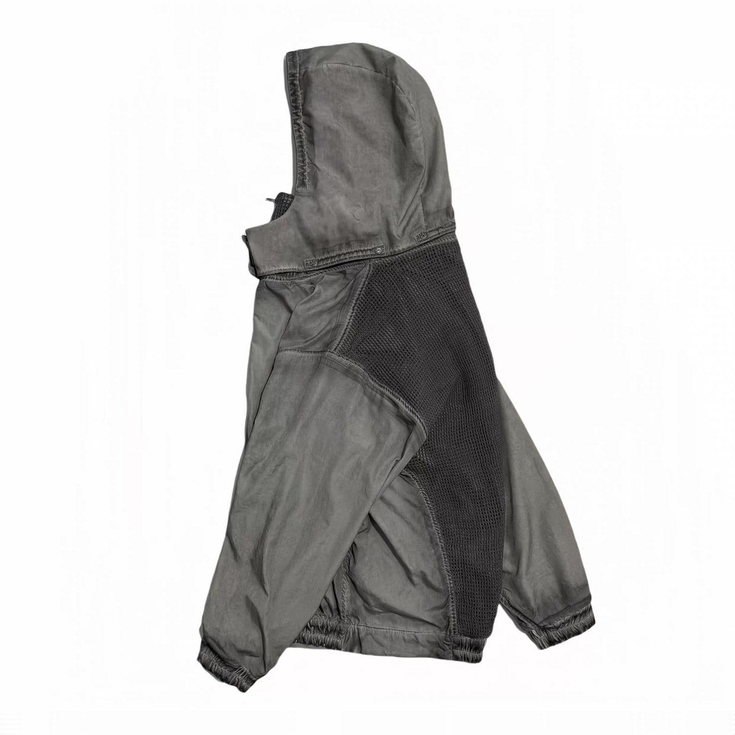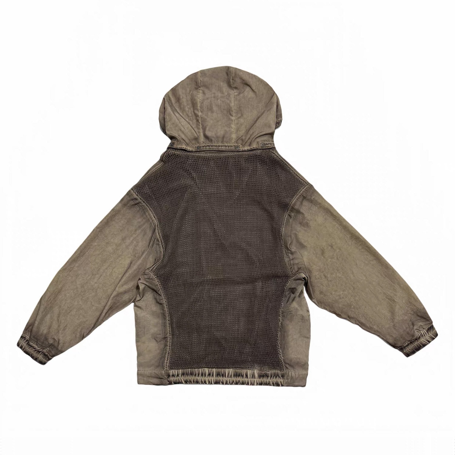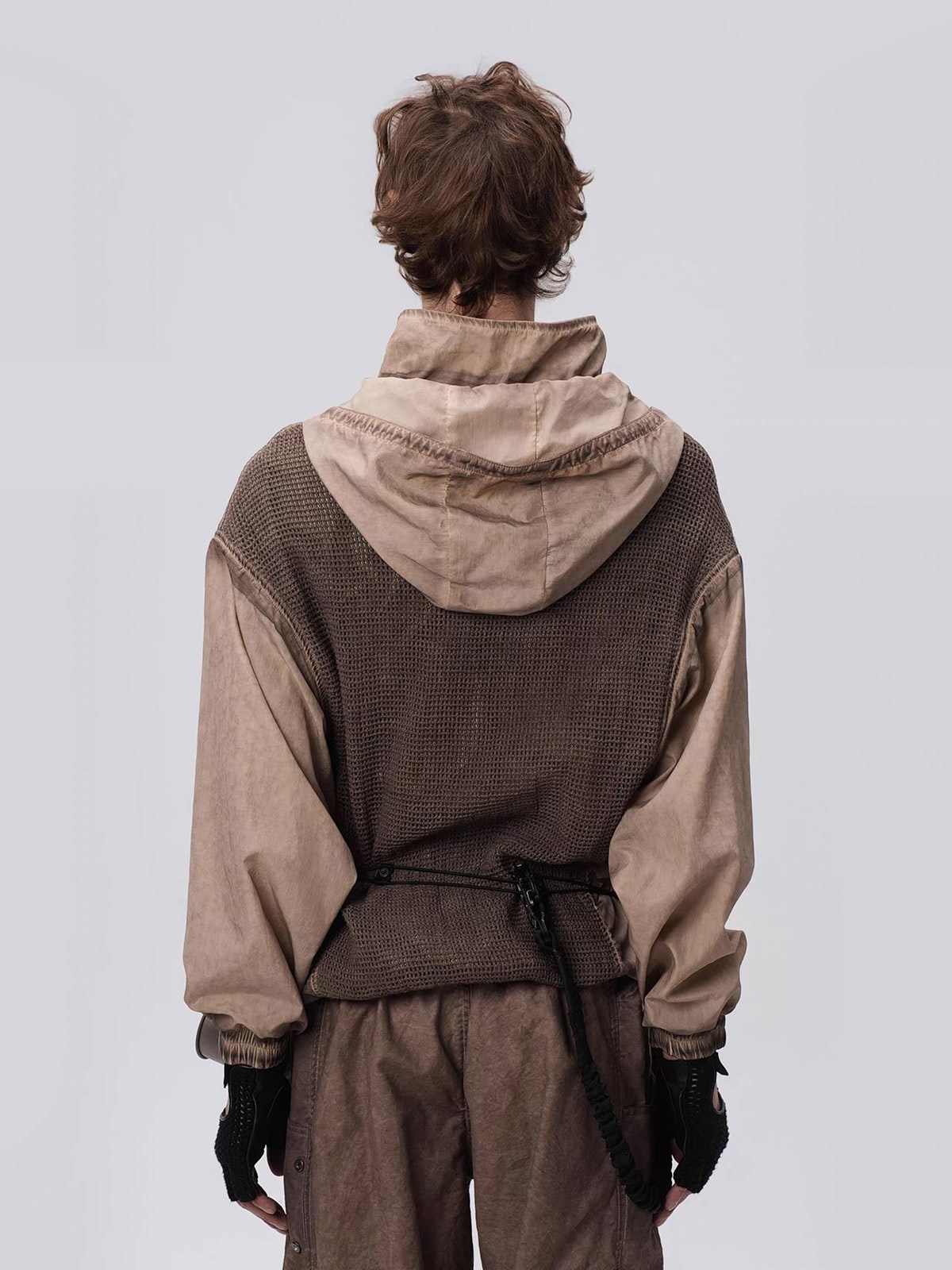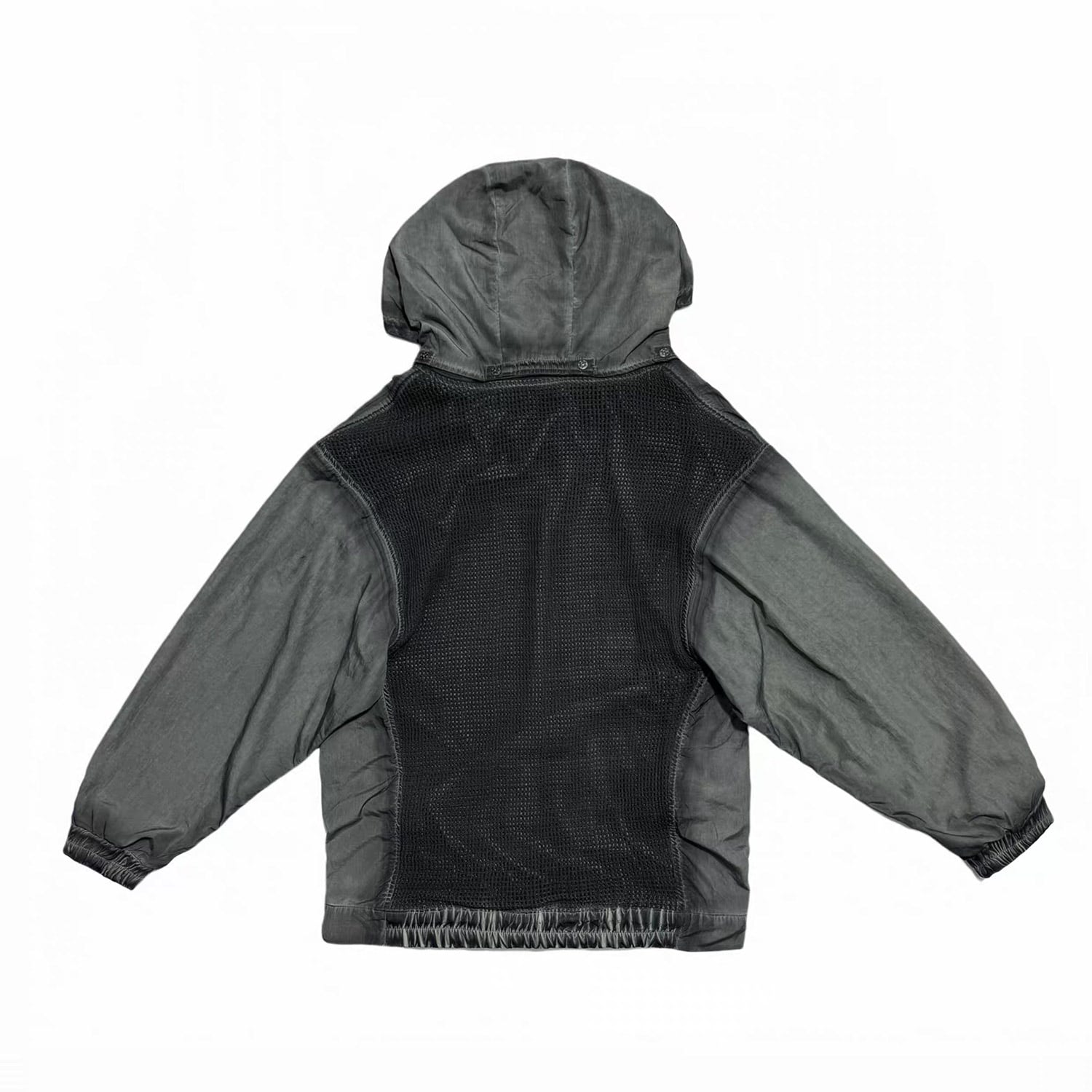 Featuring a dirty-dyed fabric treatment, this futuristic top fuses unique tailoring and practicality.