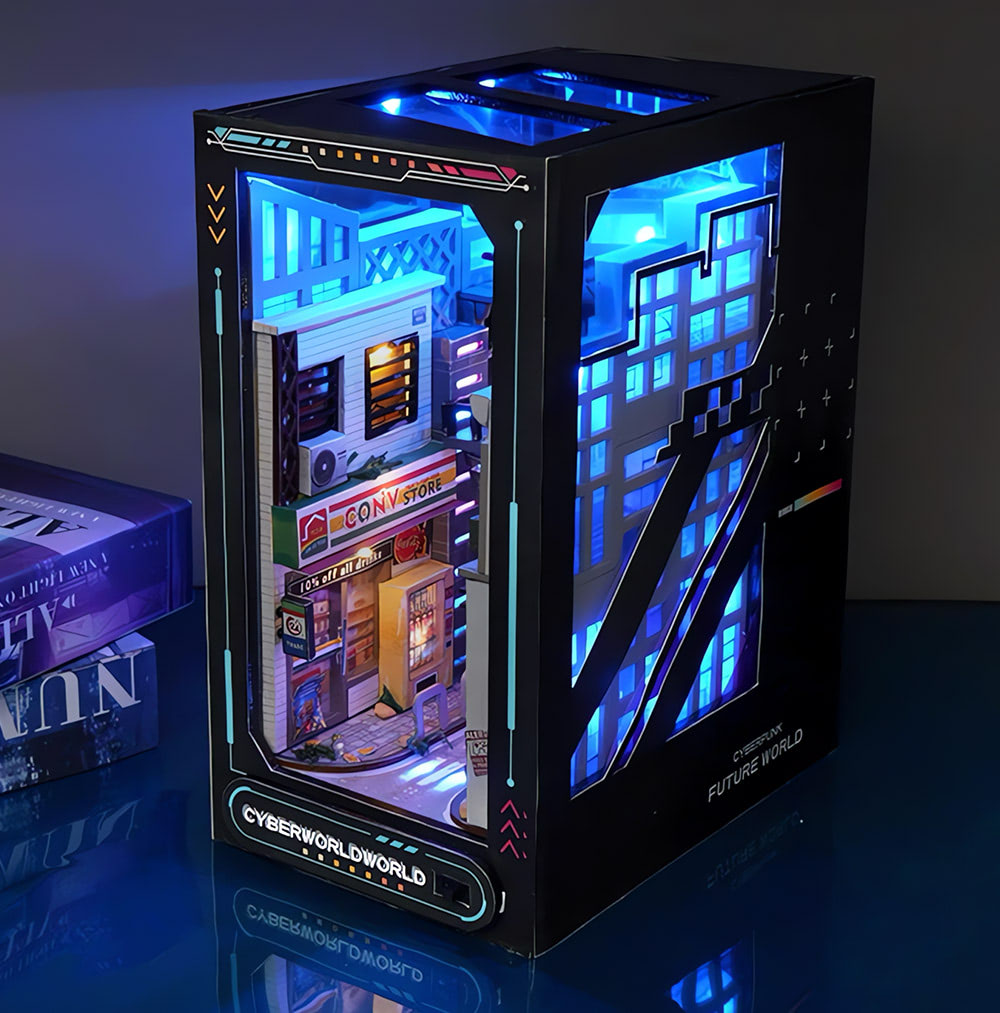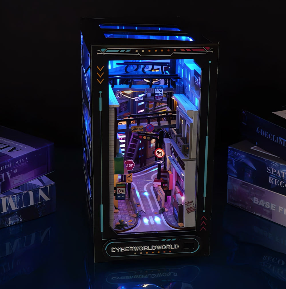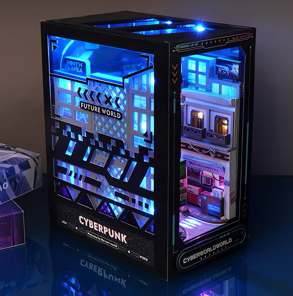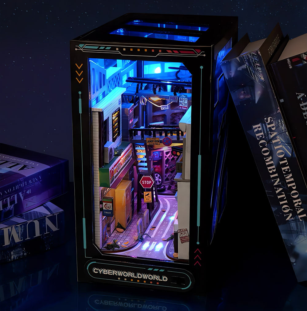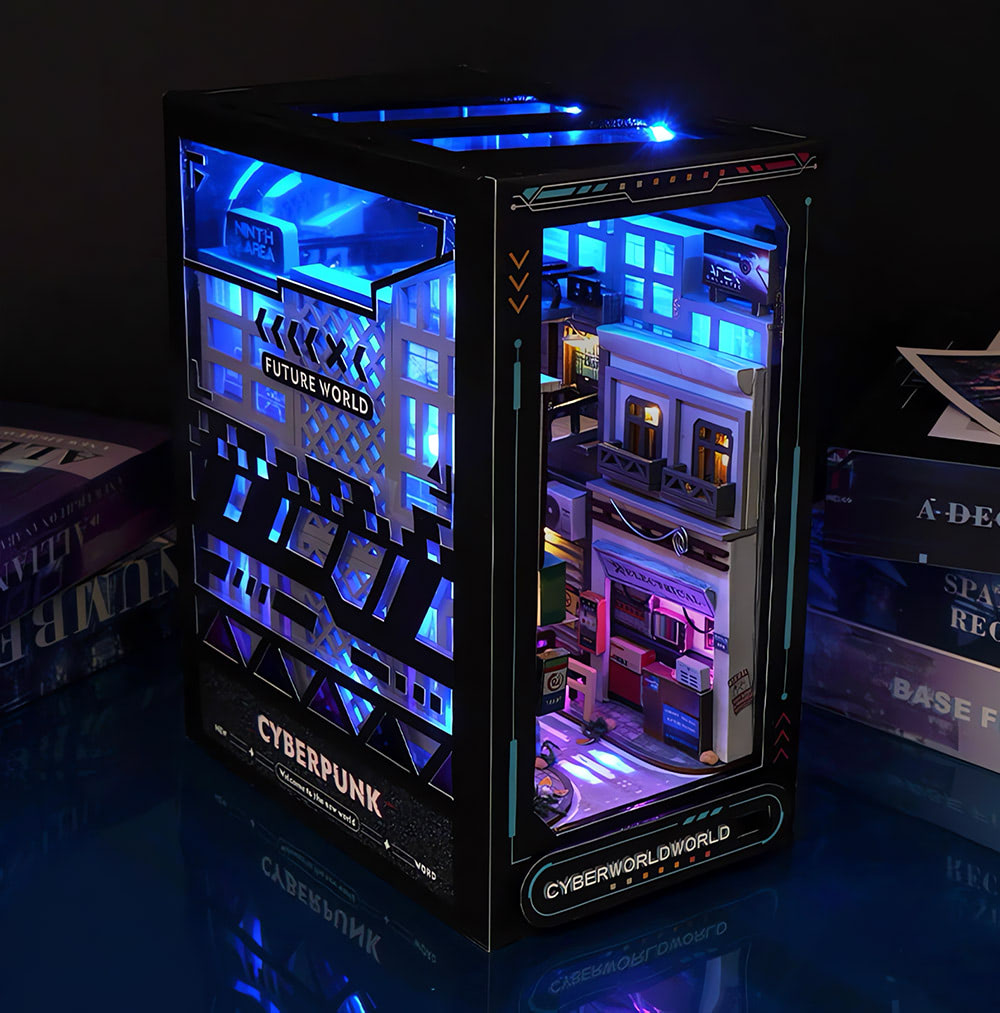 Decorate your bookshelf with this fantastic DIY cyberpunk-themed diorama scene with built-in illumination.