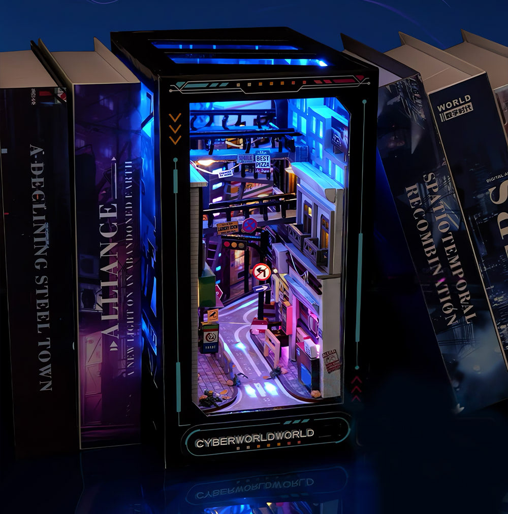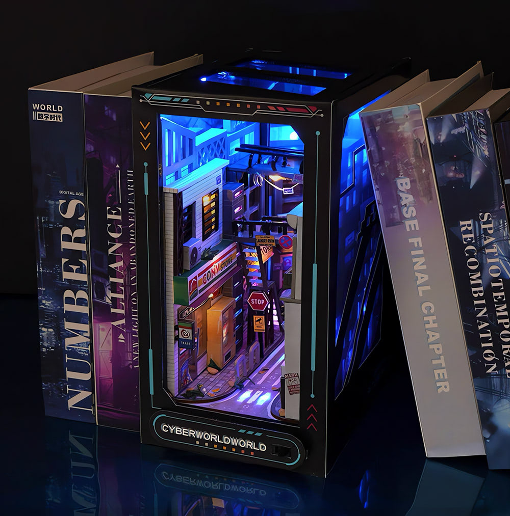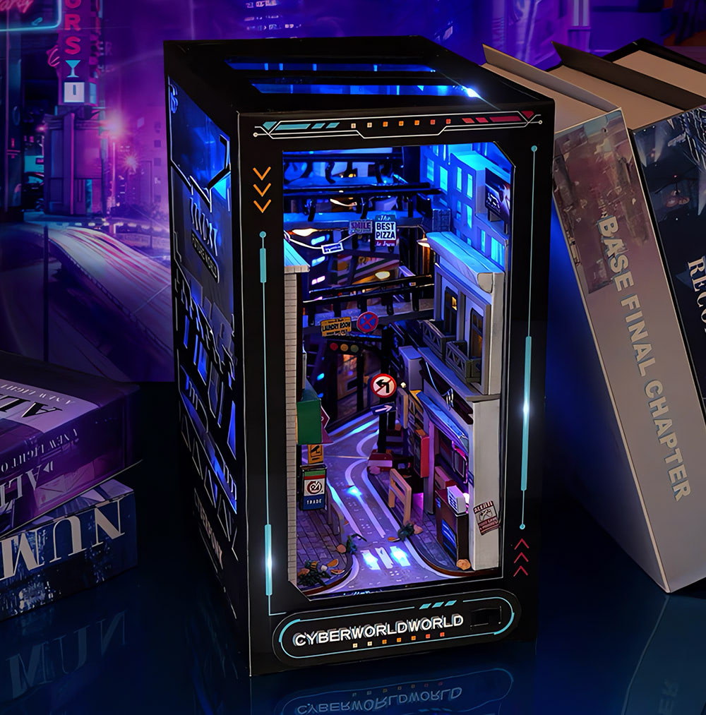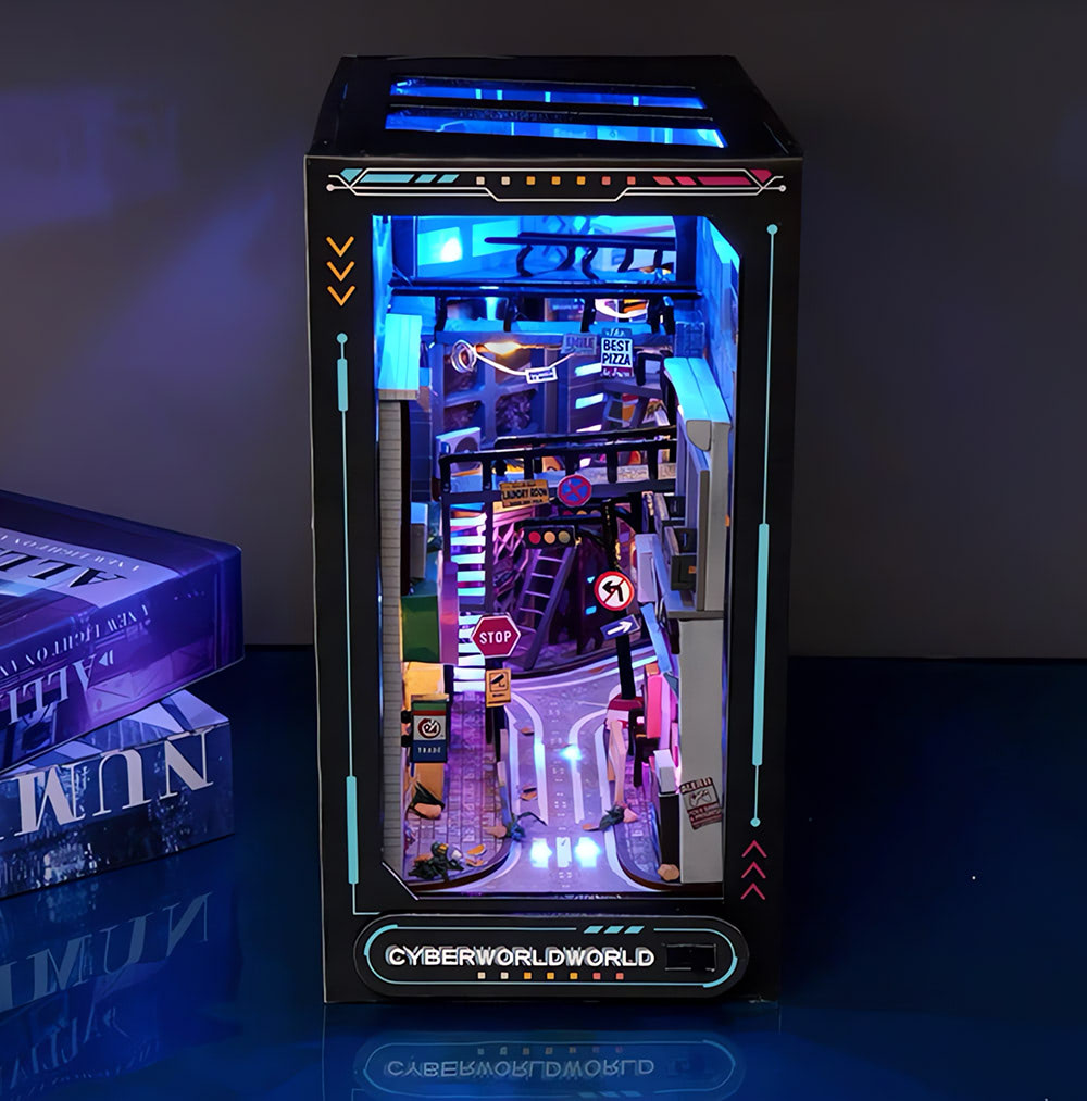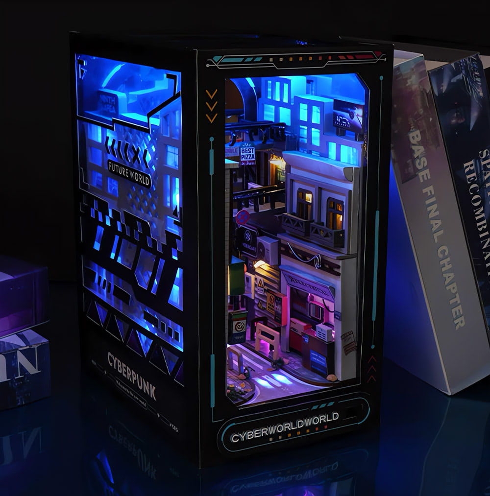 Decorate your bookshelf with this fantastic DIY cyberpunk-themed diorama scene with built-in illumination.