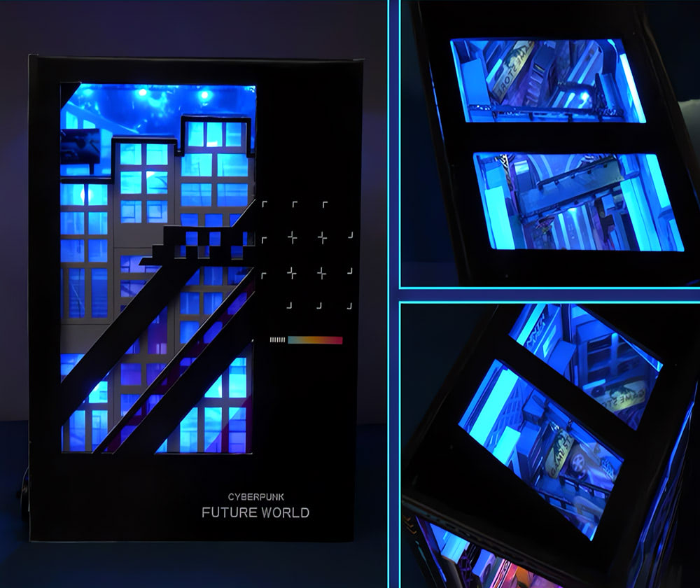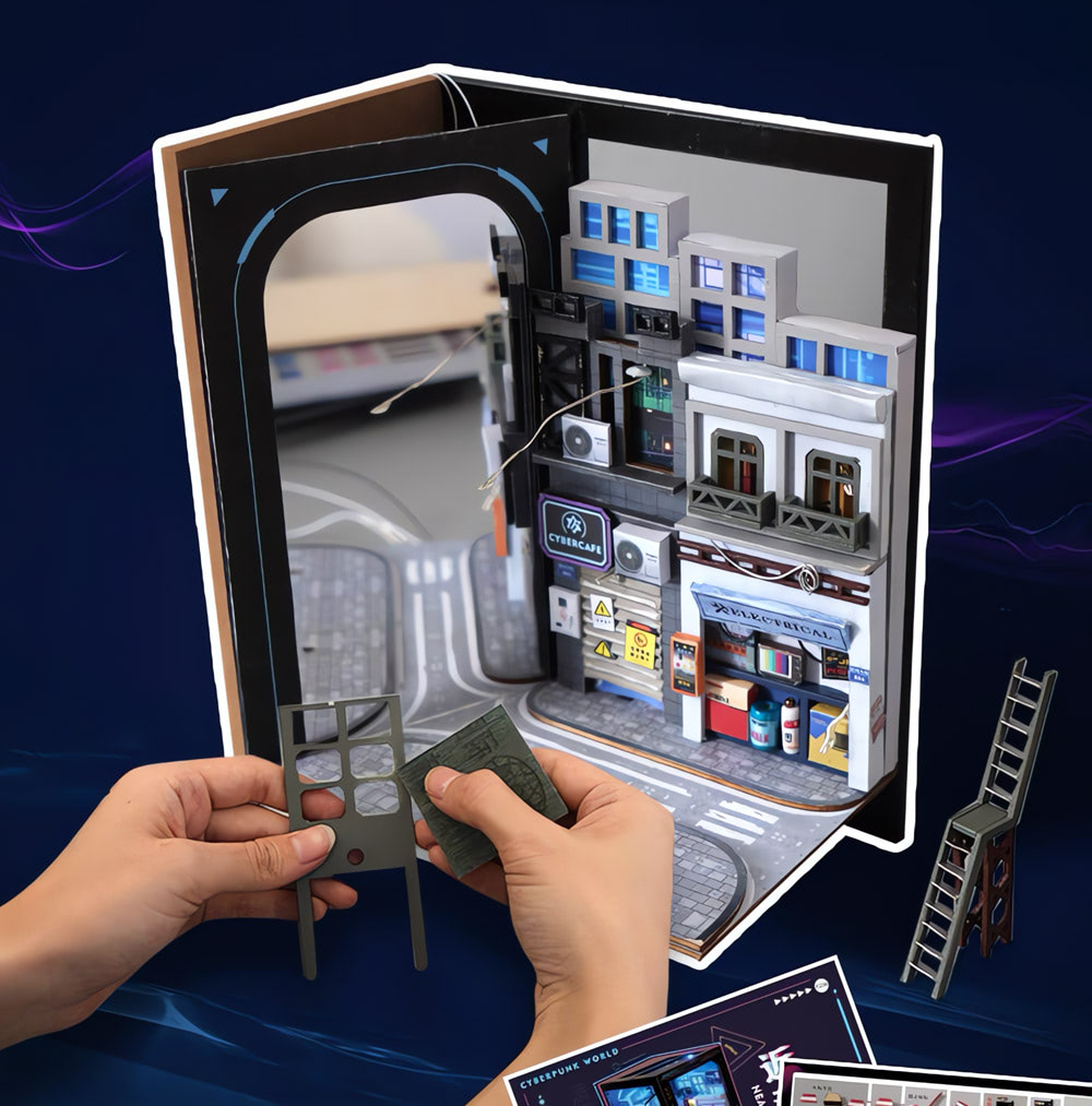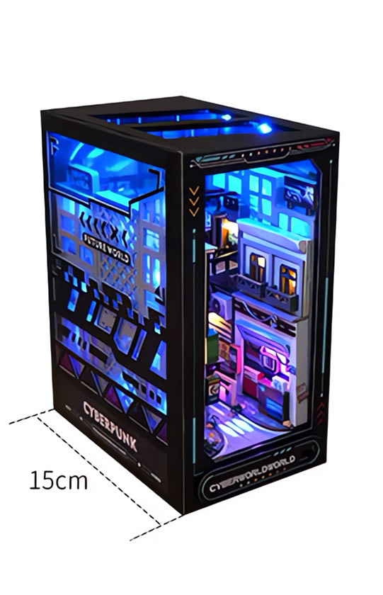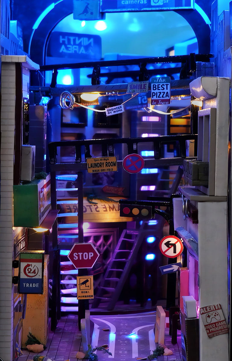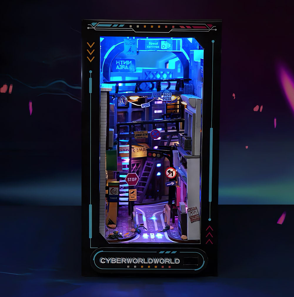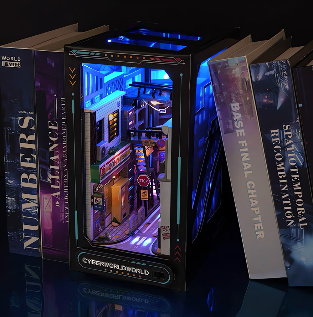 Decorate your bookshelf with this fantastic DIY cyberpunk-themed diorama scene with built-in illumination.
