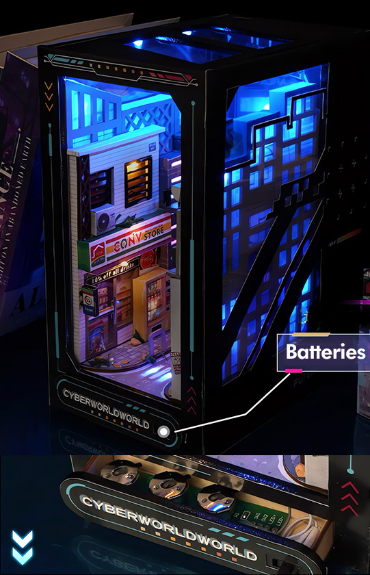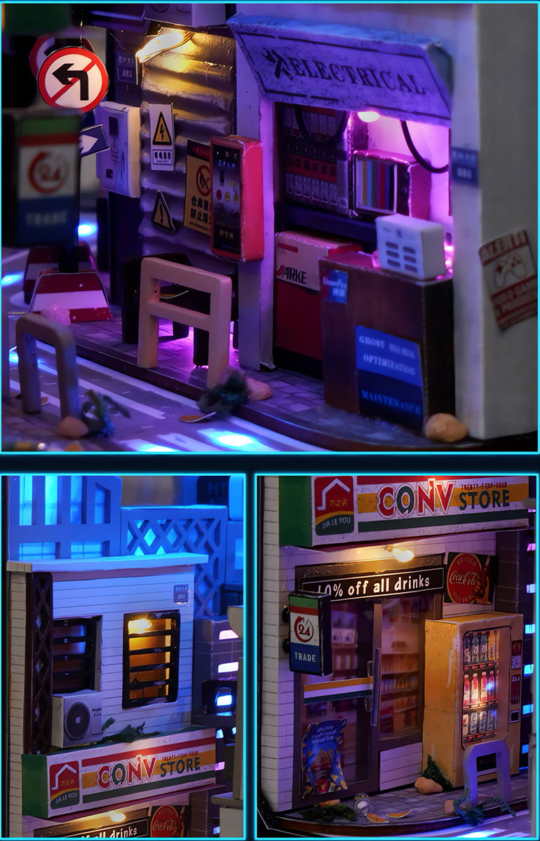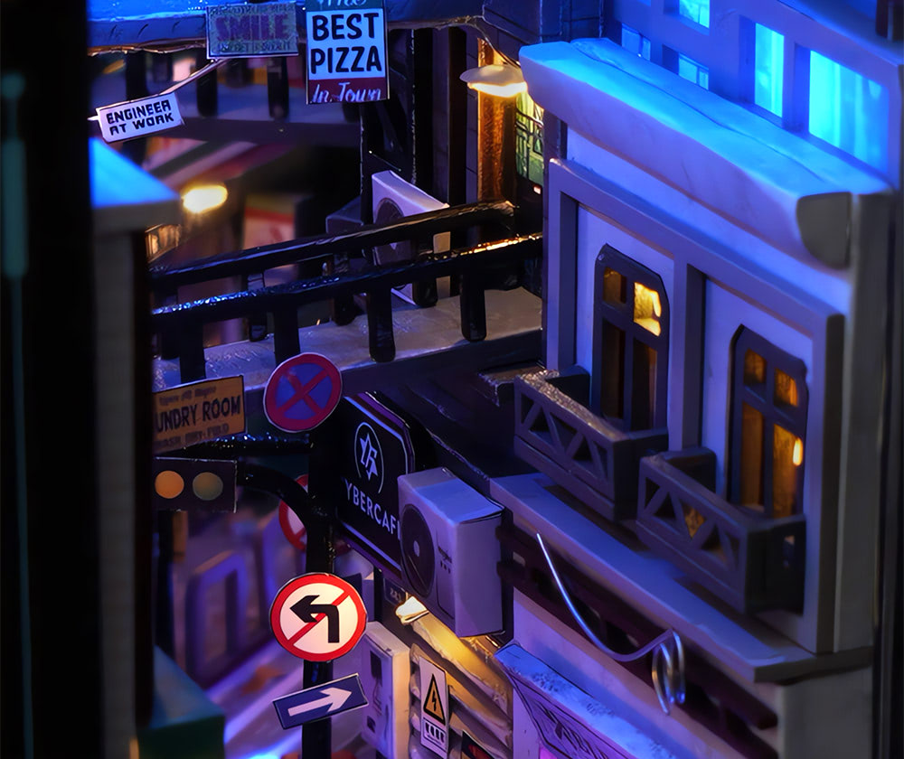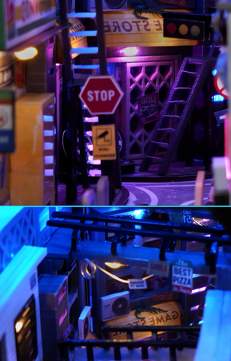 It comes with 35 mini LED light bulbs in different colors including yellow, blue and pink, which gives the classic cyberpunk illumination mood inside the diorama.