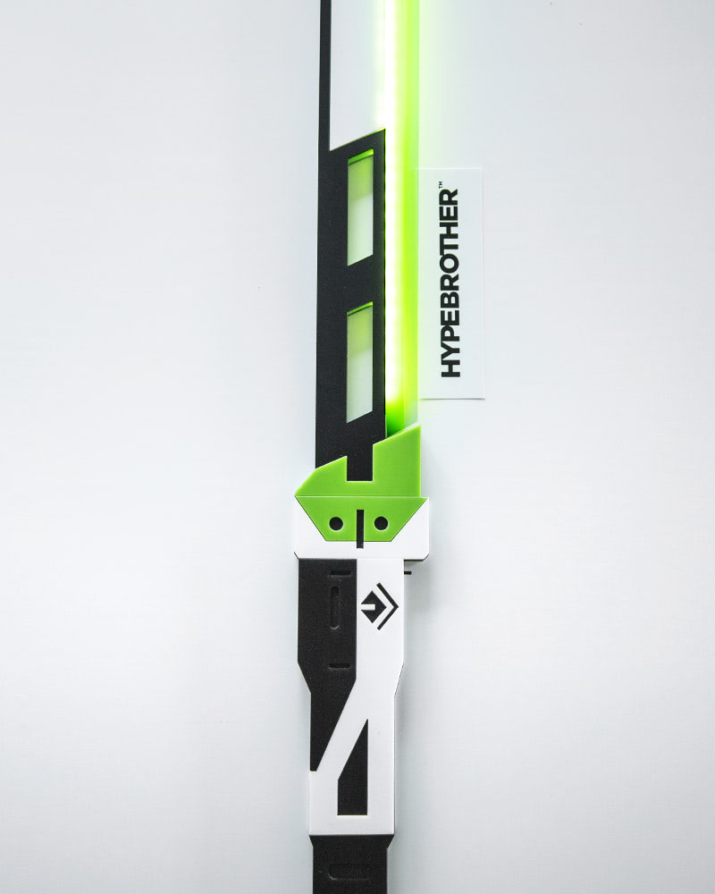 Mini Futuristic Katana with bright green LED blade powered by internal rechargeable battery.