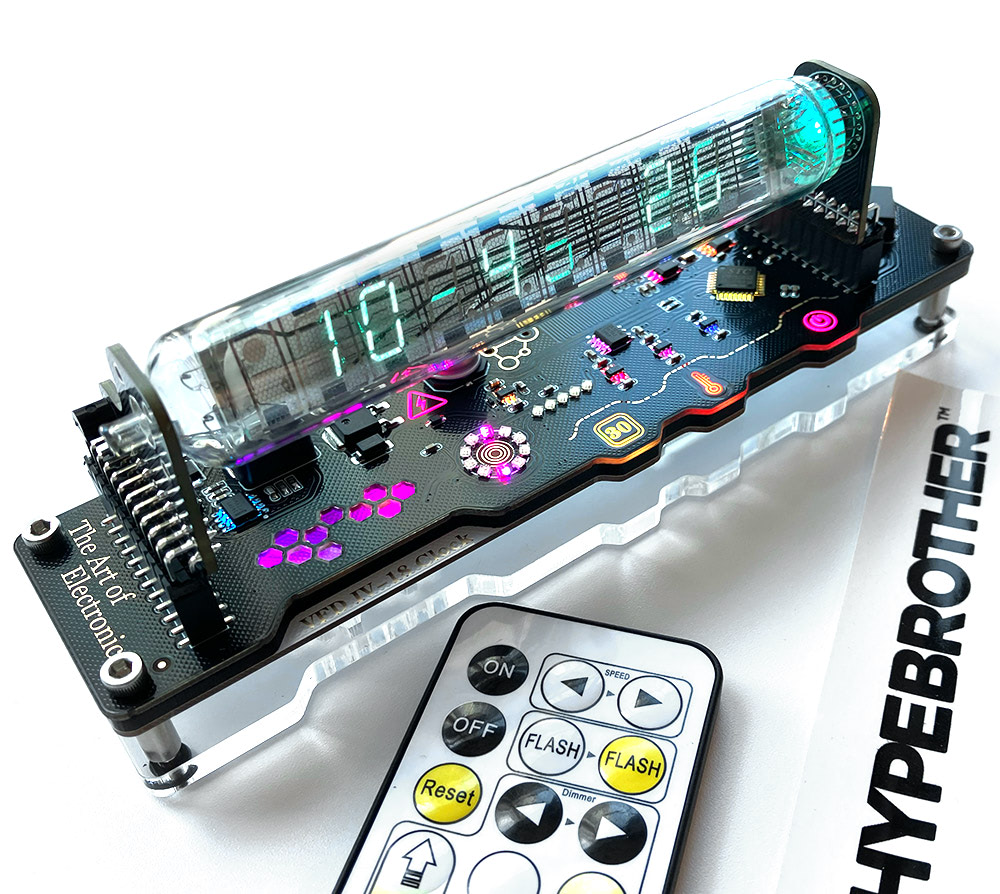 Besides showing the time, the Cyberpunk Tube Clock also displays a simple calendar, device temperature, and LED animations. It comes with a dedicated remote control, USB cable, power supply and instructions manual.
