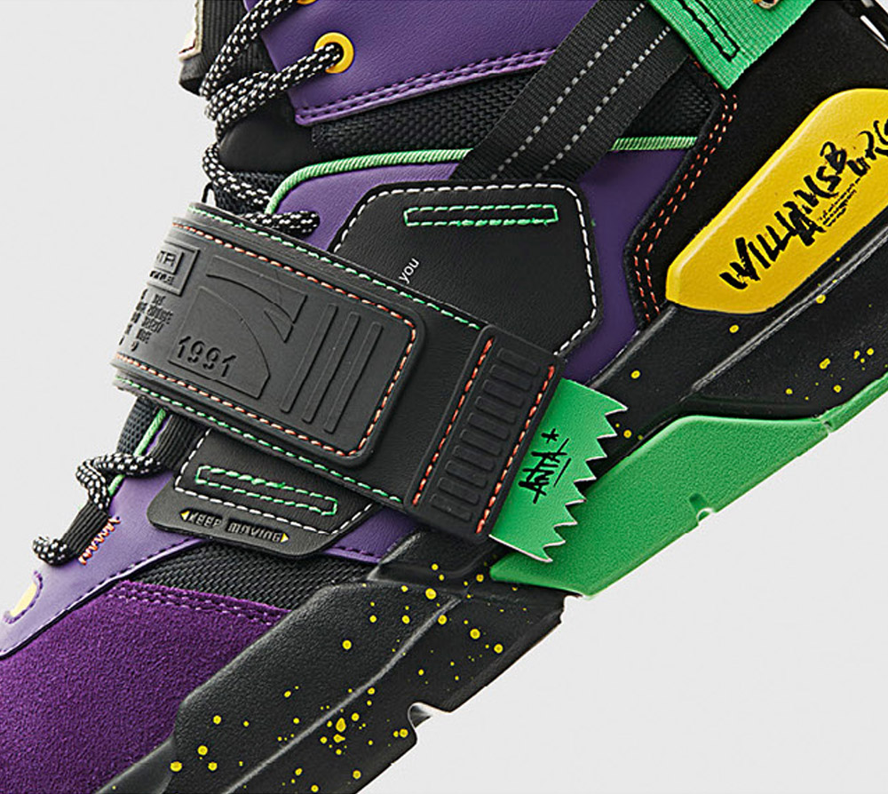 Cyberpunk-Themed Trainer (Williamsburg) by ANTA. Futuristic sneaker with lines inspired by Cyberpunk 2077 aesthetics. Its body features multiple layers of different materials and fabrics, giving it an unique futuristic look.