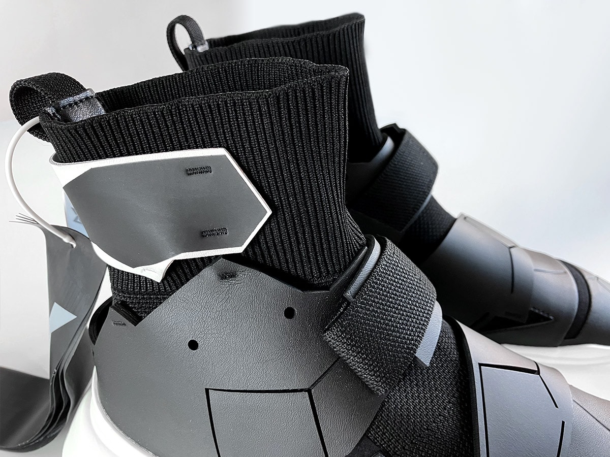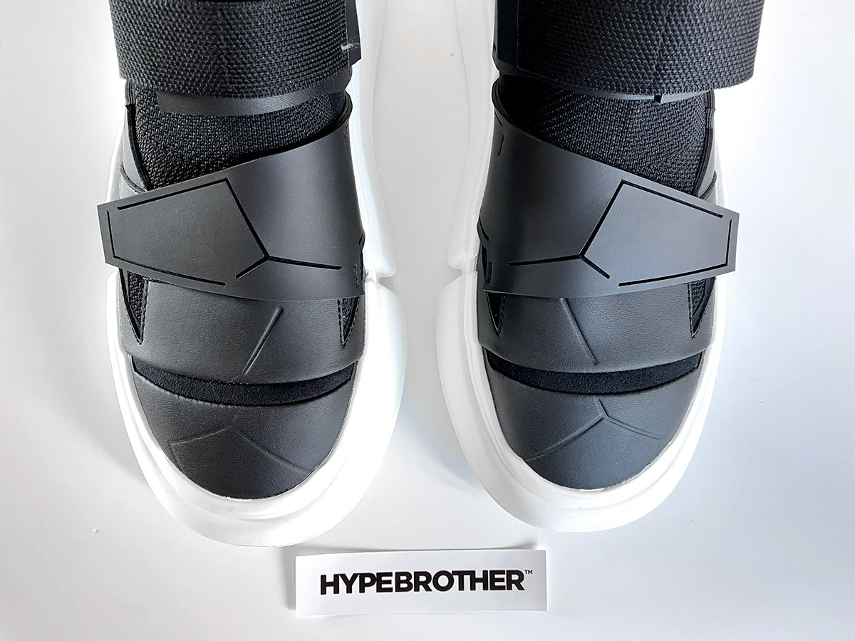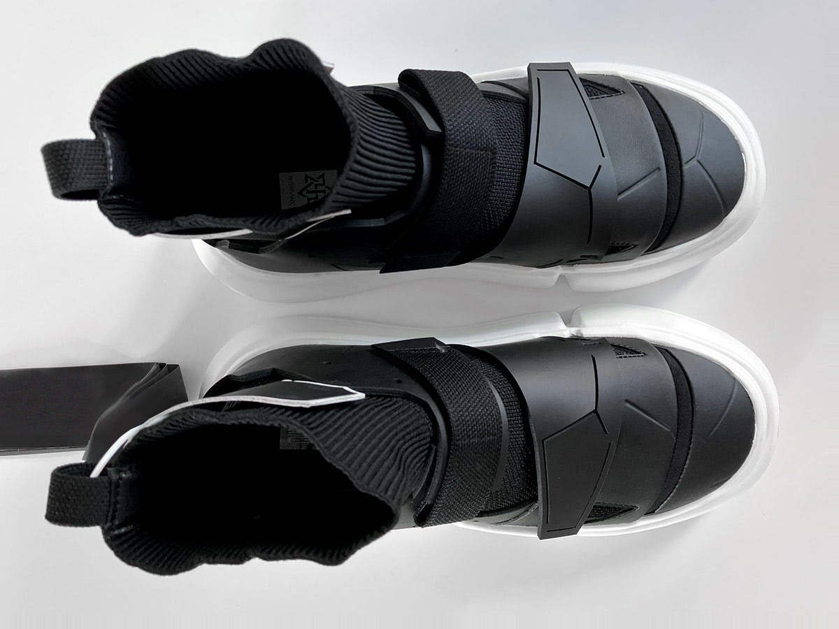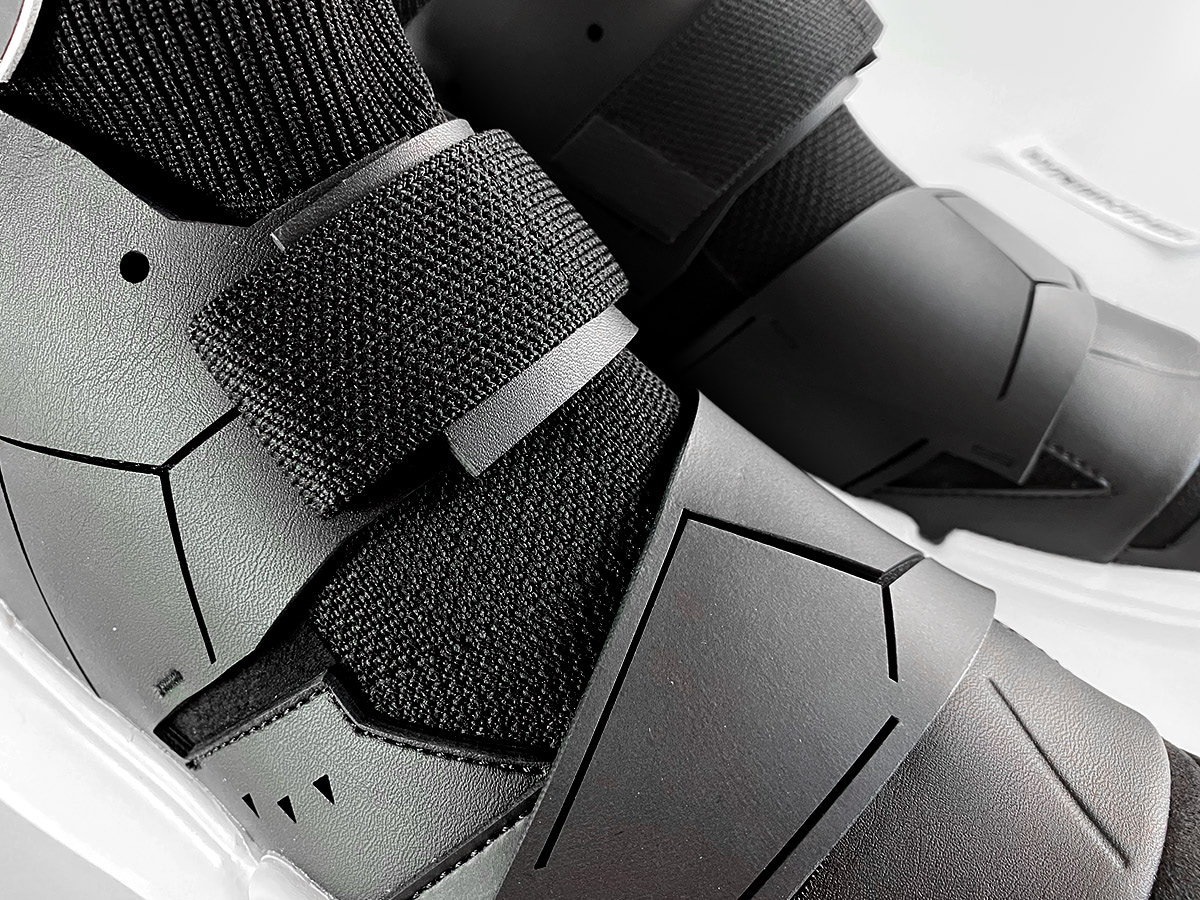 Futuristic High-Top trainer with velcro tabs in cyberpunk aesthetics.
