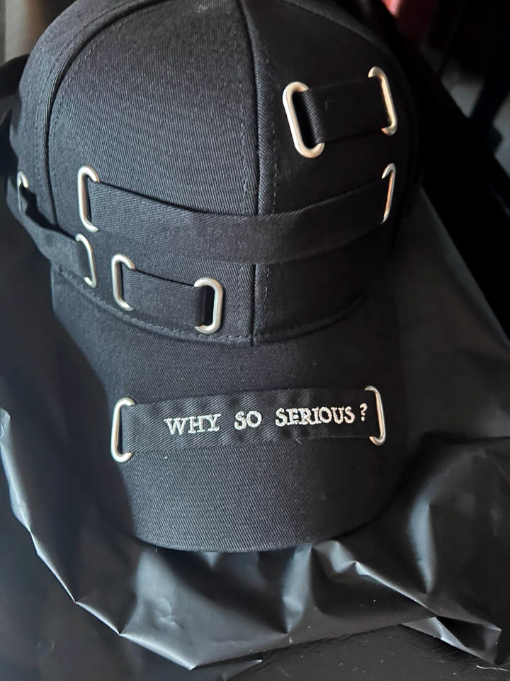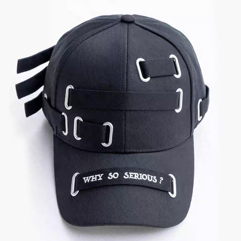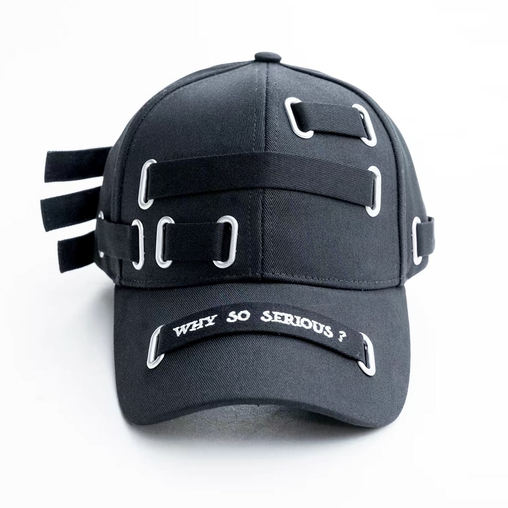 Style A featuring several metallic plate details across the brim, and Style B "why so serious" with strapped details across the cap and strong phrases printed on the adjustment straps.