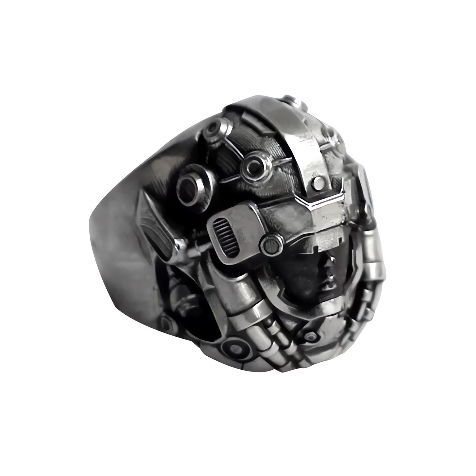 Futuristic ring featuring a cyberpunk-inspired cyborg head sculpt in three dimensional design.