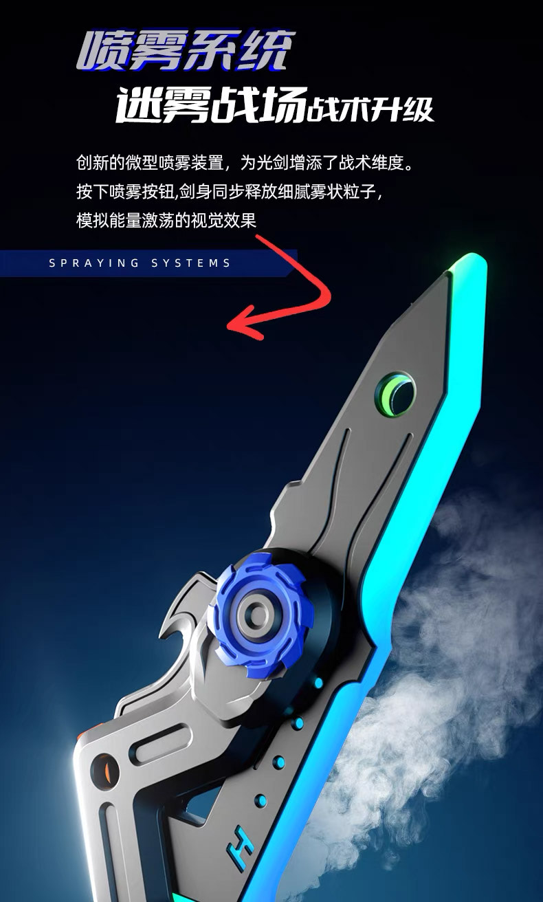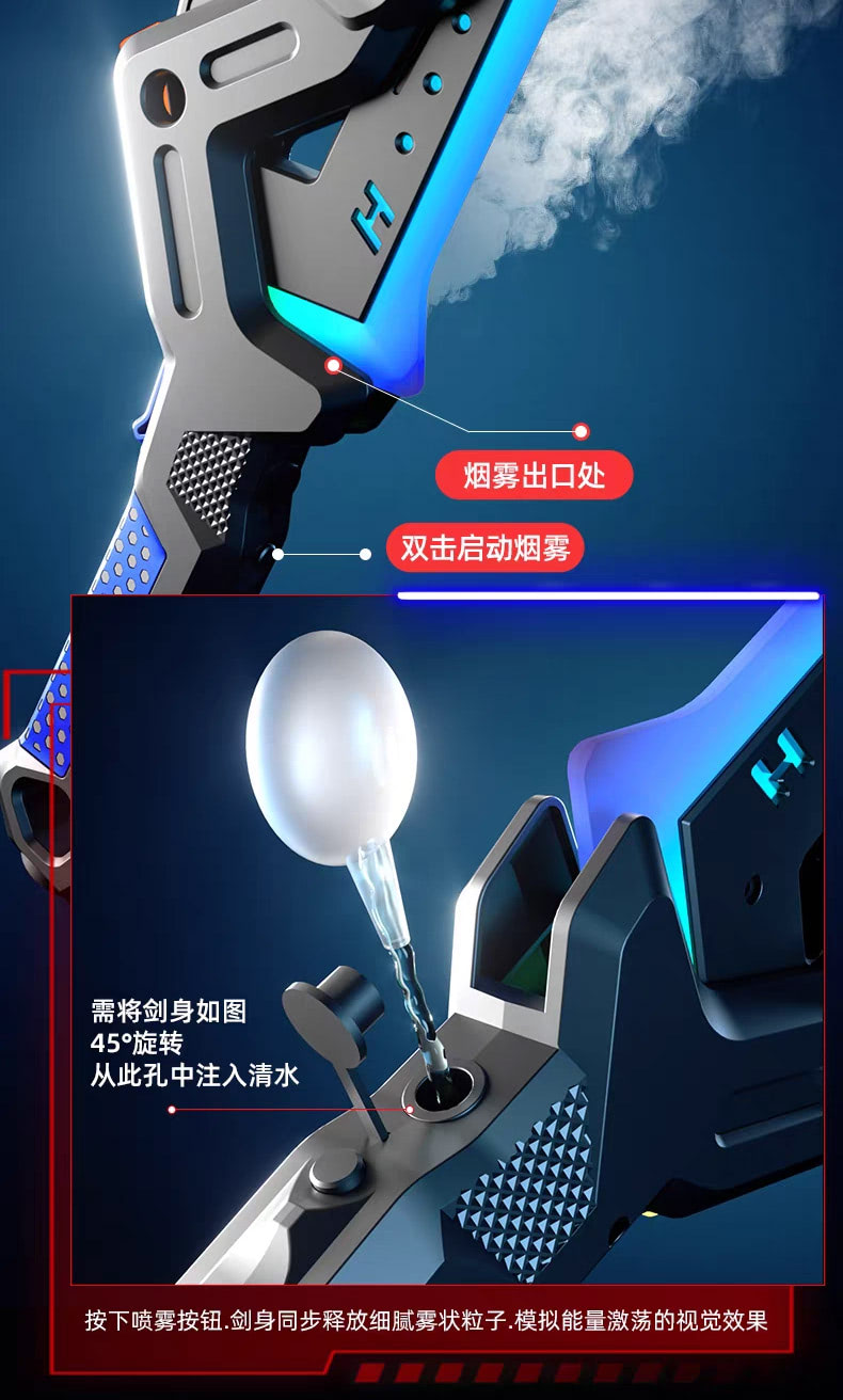 Adding to the spectacle is the smoke spray system. With a simple double-click, the blade releases fine mist particles that simulate surging energy. Rotate the sword 45 degrees, pour water into the chamber, and press the spray button to unleash a cloud of cinematic vapor. This feature creates a dramatic visual effect, making every battle look like it belongs on the big screen.