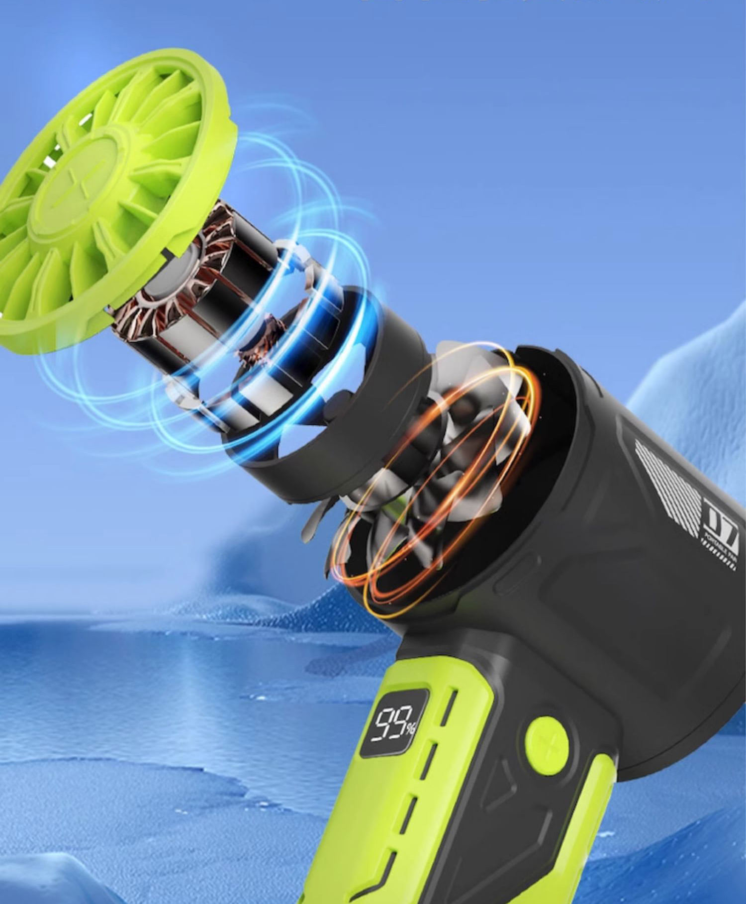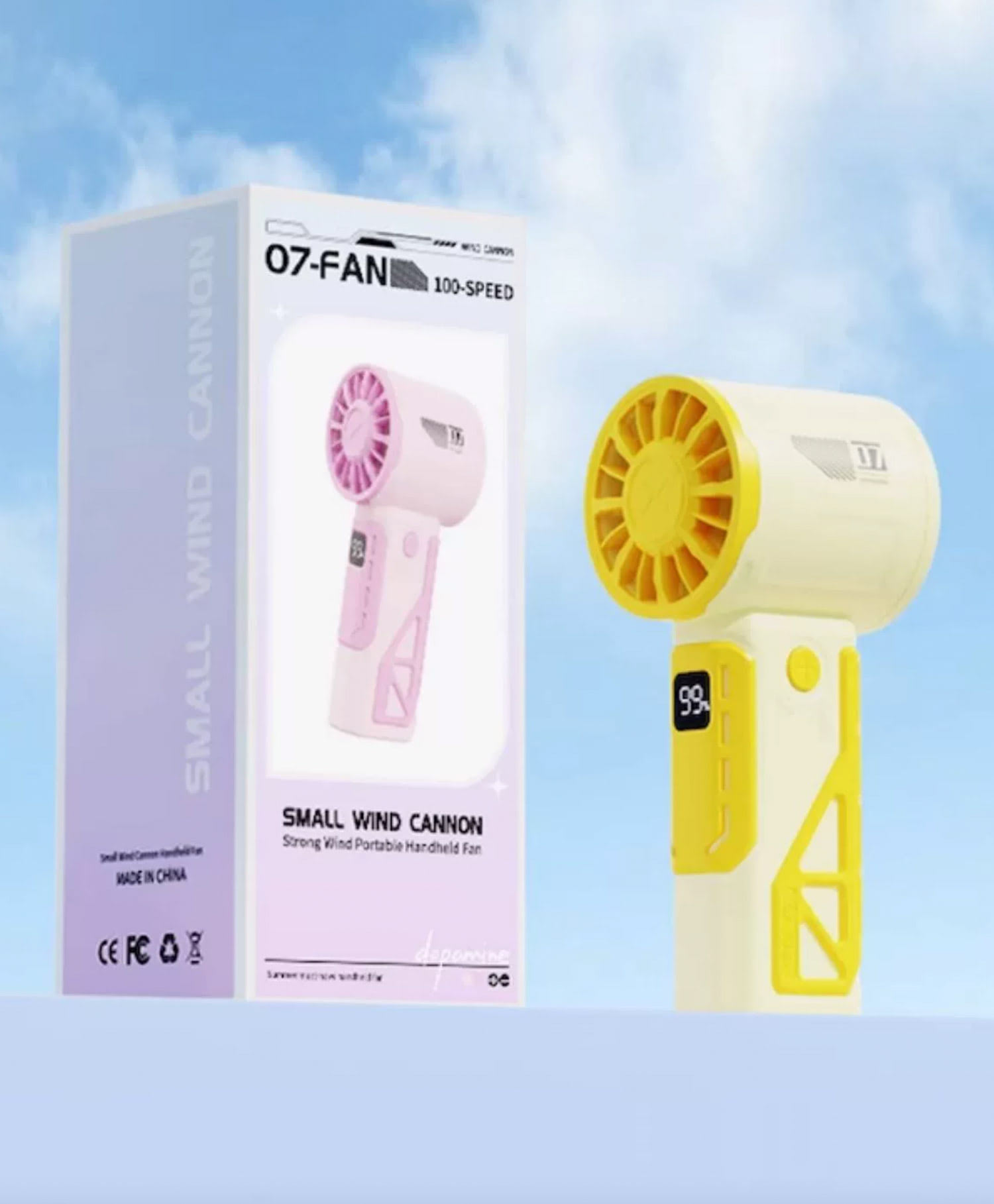 Keep yourself super cool with this personal handheld fan featuring a turbo fan and futuristic design inspired by mecha aesthetics.