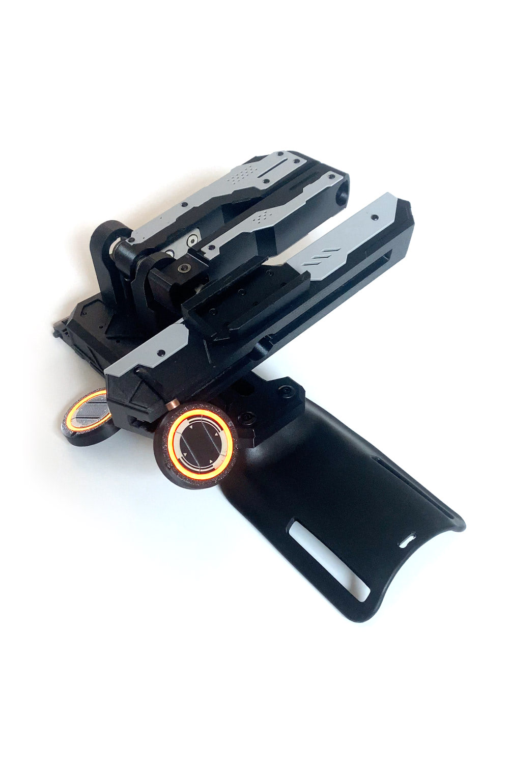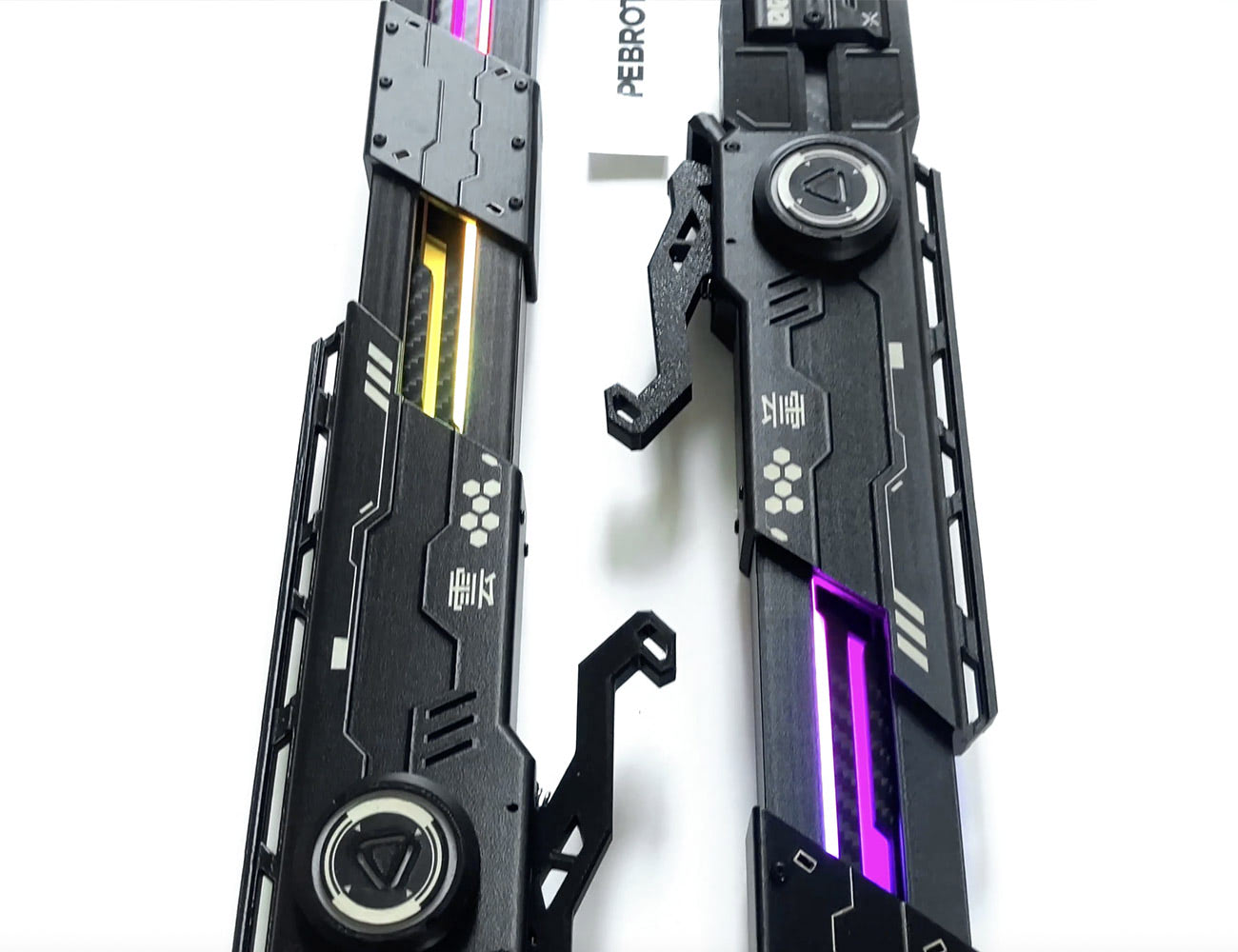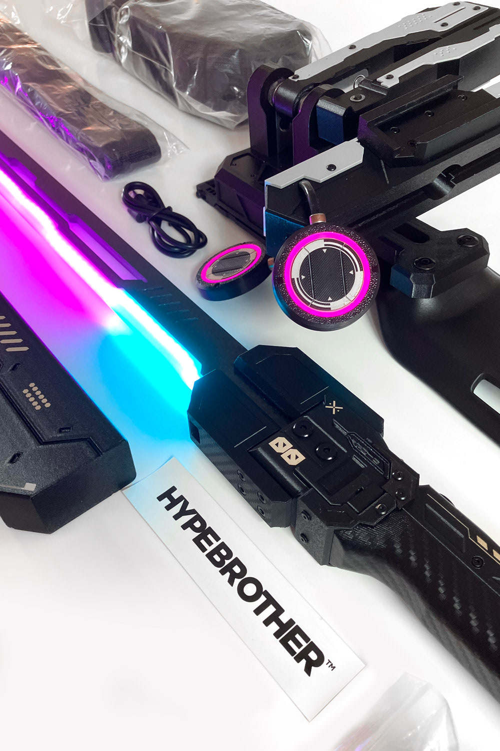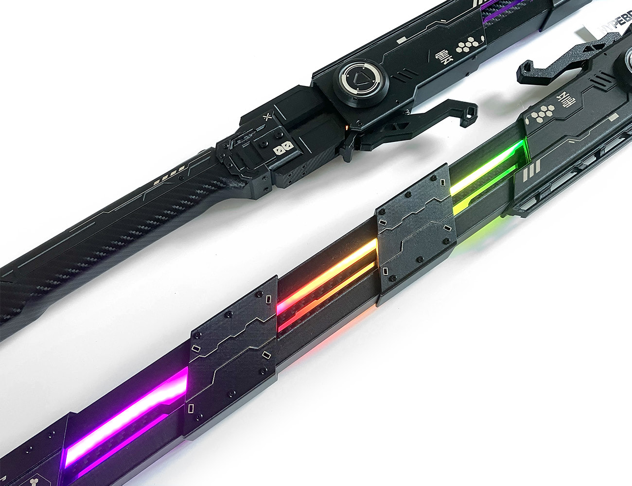 Limited Production Cyberpunk Katana with automatic (catapult-style) ejection system, animated RGB blade controlled via mobile app, and a LED-powered waist suspension dock.